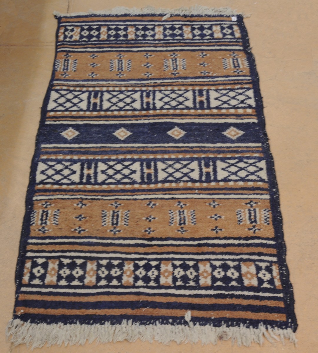 TAPIS en laine à points noués à décor bleu, crème et brun de frises géométriques. 130 x 75 cm.