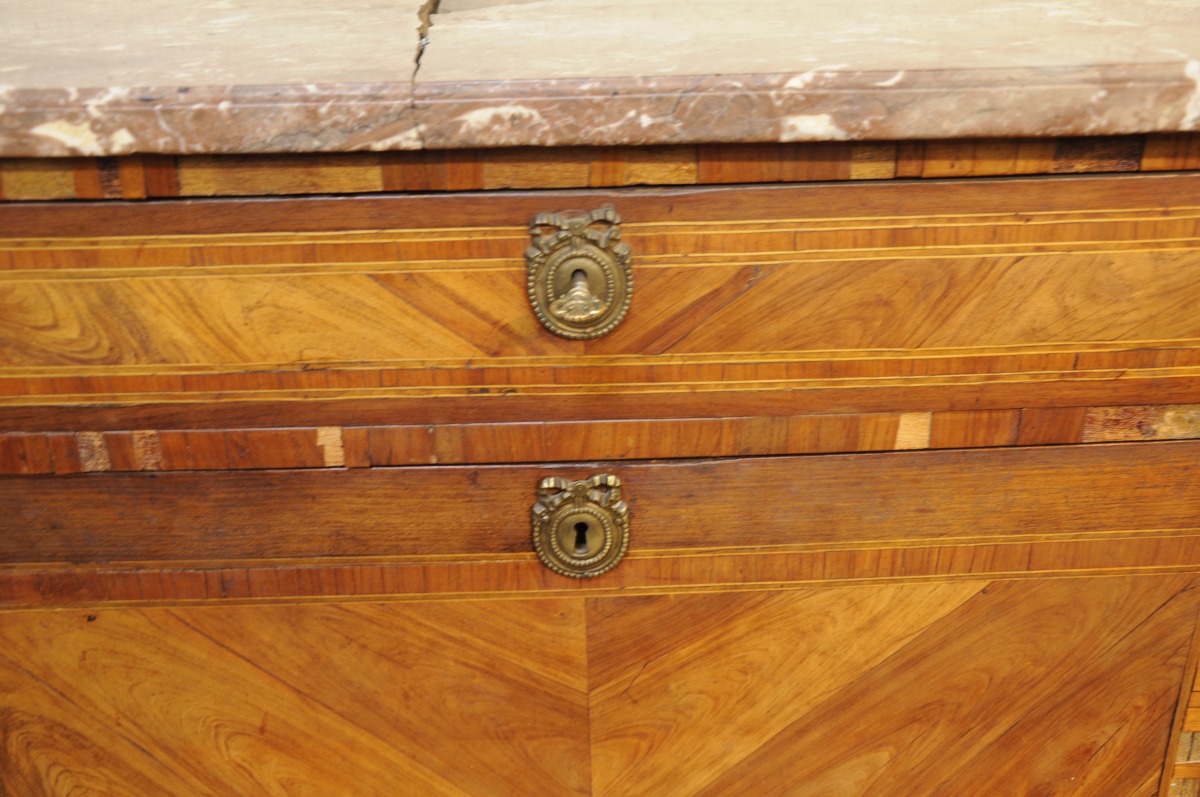 SECRÉTAIRE en bois de placage et filets de bois clair ouvrant par un tiroir, deux vantaux et un abattant découvrant quatre casiers et six tiroirs, les montants à pans coupés. Dessus de marbre rouge de Bourgogne.