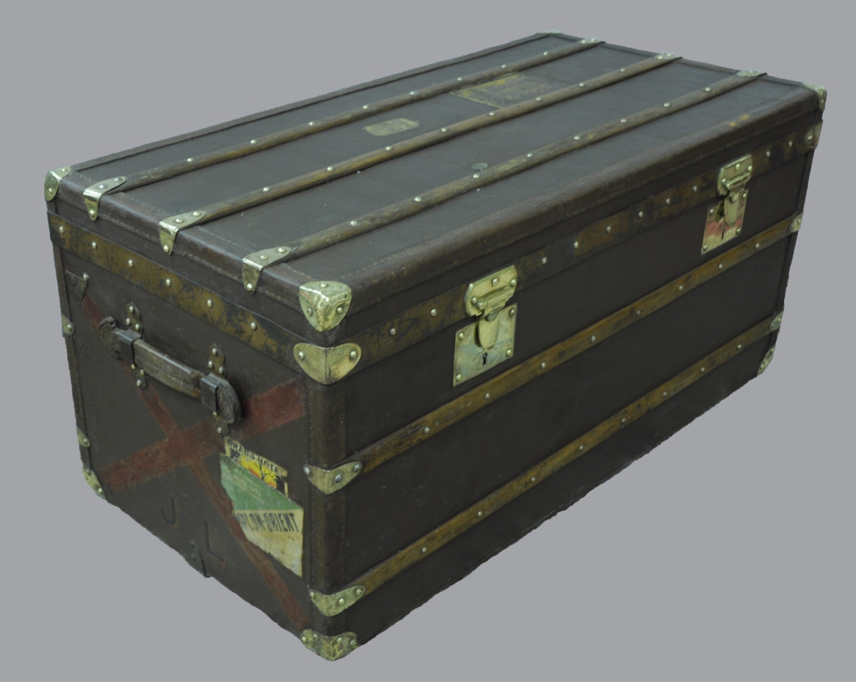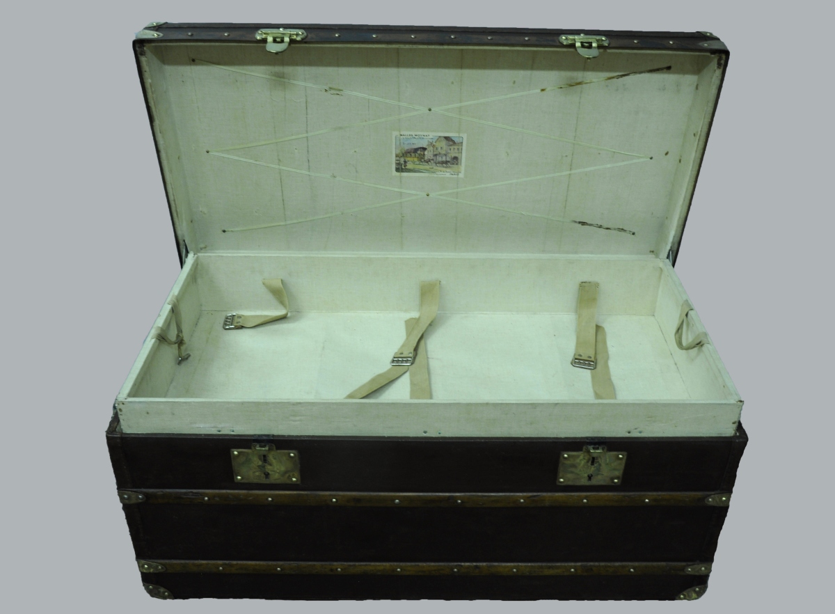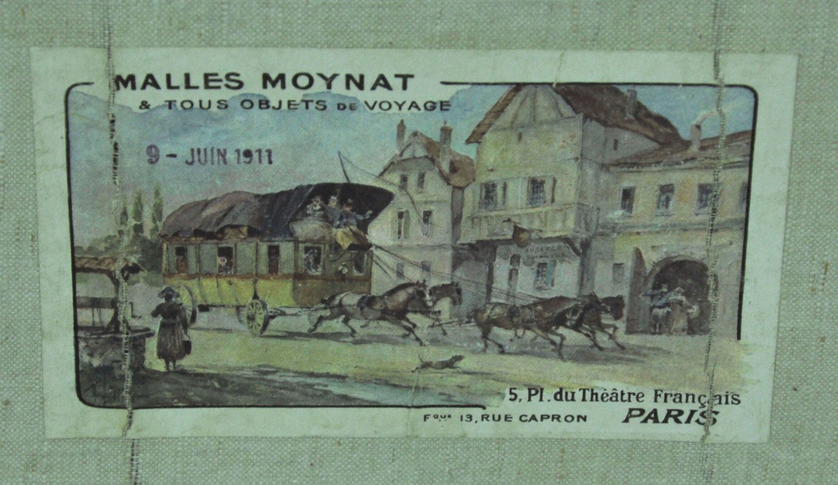 MOYNAT. Malle courrier en bois recouvert de toile enduite brune. Renforts en hêtre. Bordures et poignées en cuir. Coins, clous et fermetures en laiton. Garnie à l'intérieur de toile beige, avec deux casiers amovibles. Monogrammée JL sur les côtés. Sous le couvercle, étiquette "Malles Moynat, 5 Pl. du Théâtre Français, Paris. Fque 13, rue Capron", portant la date au tampon "9 JUIN 1911". Sur les côtés, logo triangulaire d'après le modèle de Henri Rapin. Fermetures marquées "Moynat fabricant 5, Place du Théâtre français". Diverses étiquettes de voyage : "Bellevue Palace Berne", "Simplon Orient-Express, Compagnie nationale des wagons-lits". Avec sa clé, n°23.