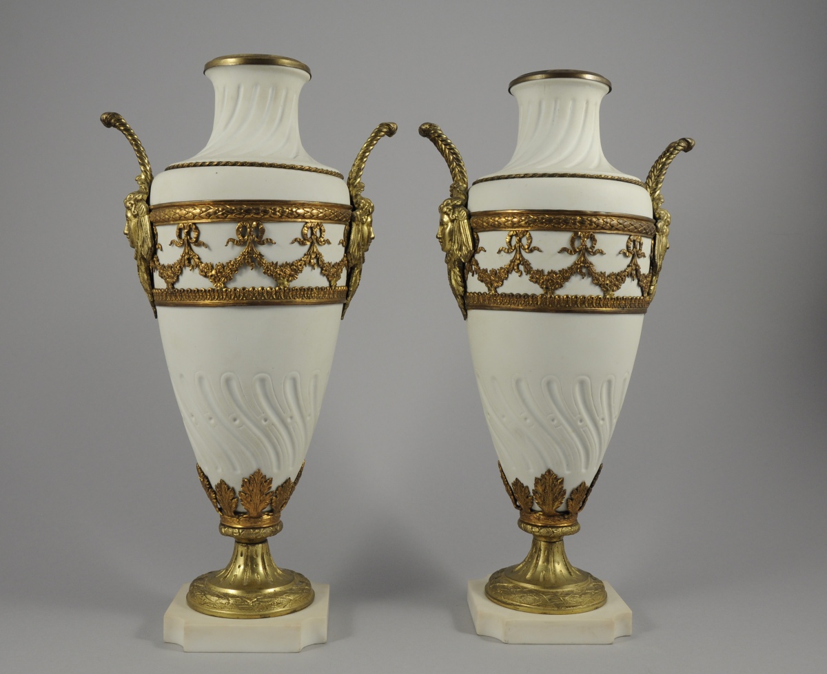 PAIRE de VASES D'ORNEMENT en biscuit et monture de régule doré, en forme d'amphores. Col à cannelures torses et partie inférieure à godrons séparés par de petits cercles. La panse est cerclée d'une frise de guirlandes de fleurs retenues par des noeuds de rubans, entre un tore de lauriers et une bande de feuilles d'eau. De part et d'autre, visages de femmes à la base des anses. Pied à décor de lauriers enrubannés et de larges feuilles.