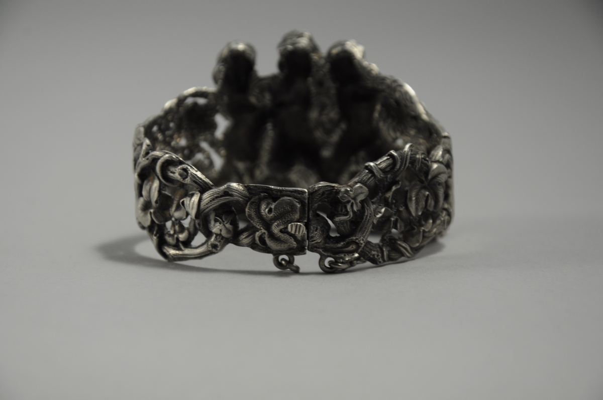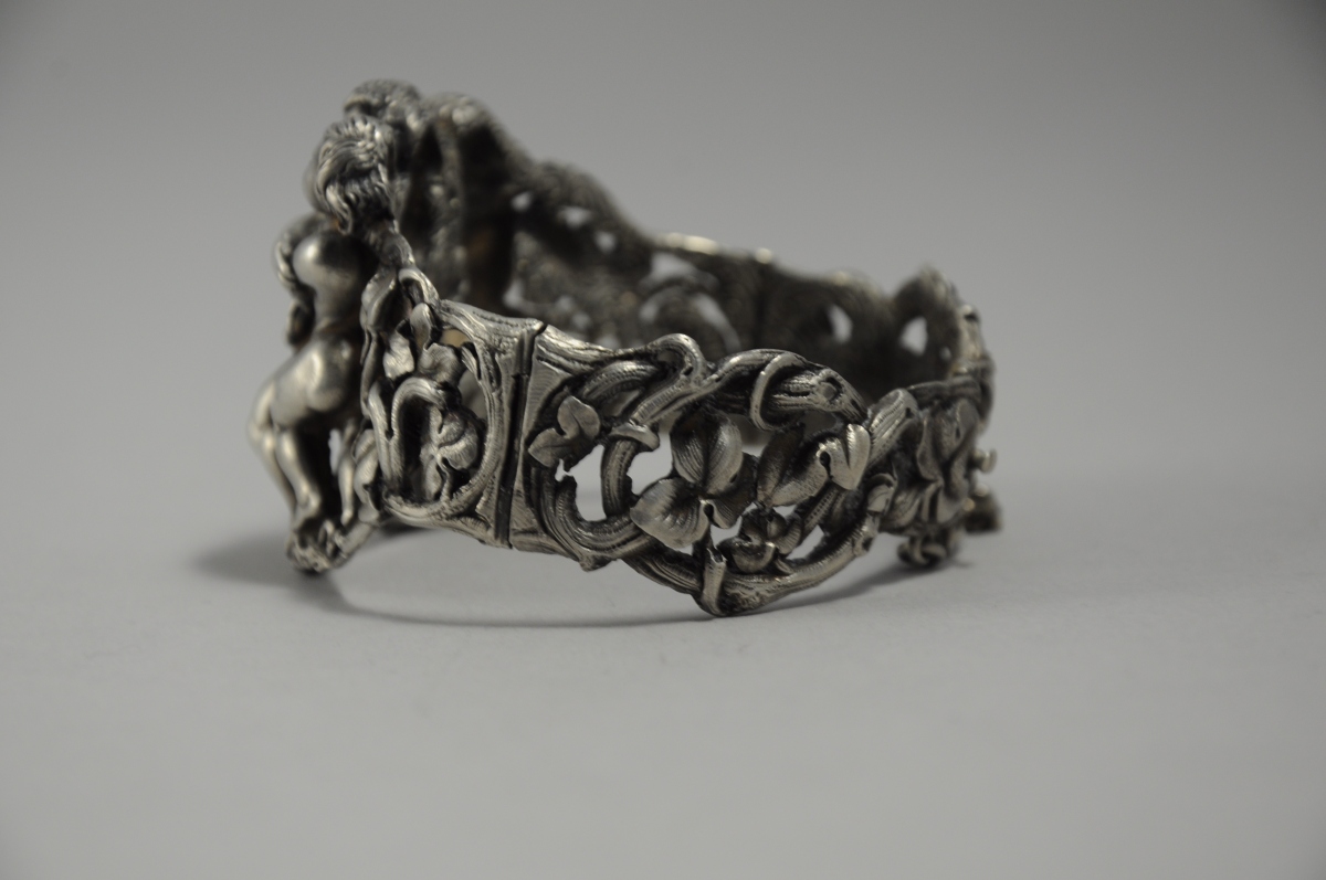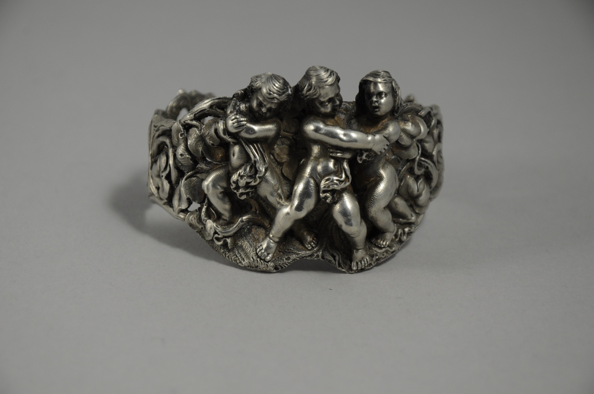 BRACELET semi-rigide en argent à décor central en relief de trois putti et latéral ajouré de branchages et feuilles entrelacés.