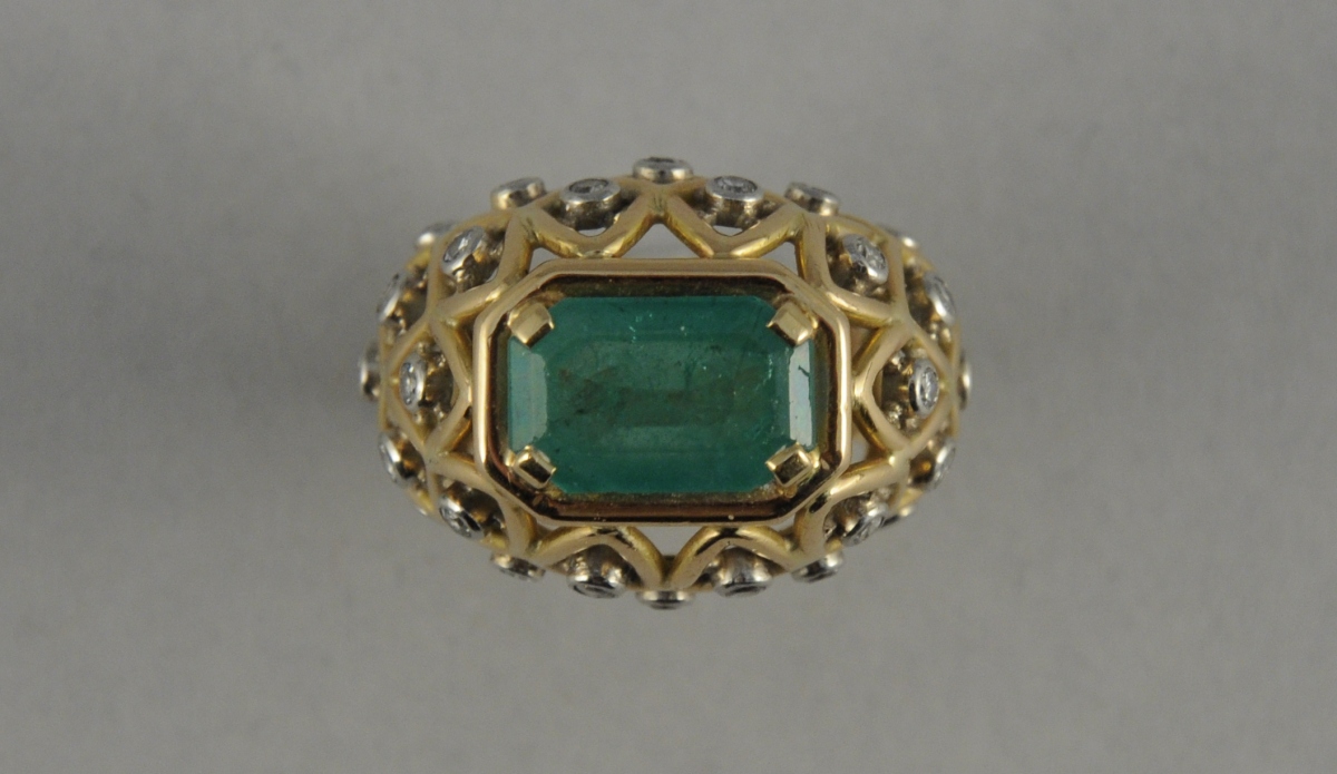 BAGUE boule en platine et or jaune ajouré à décor géométrique, partiellement sertie de petits diamants, ornée au centre d'une émeraude rectangulaire à pans coupés d'environ 3 / 3,50 carats. Poids brut : 16 g.