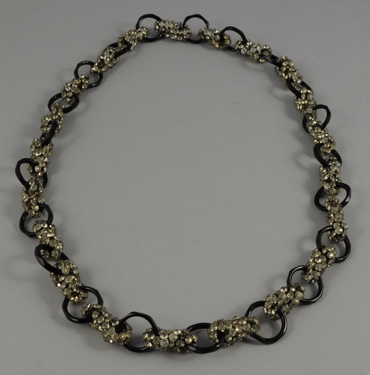 SAUTOIR composé d'anneaux de verre noir facettés alternés de motifs torsadés sertis de strass.