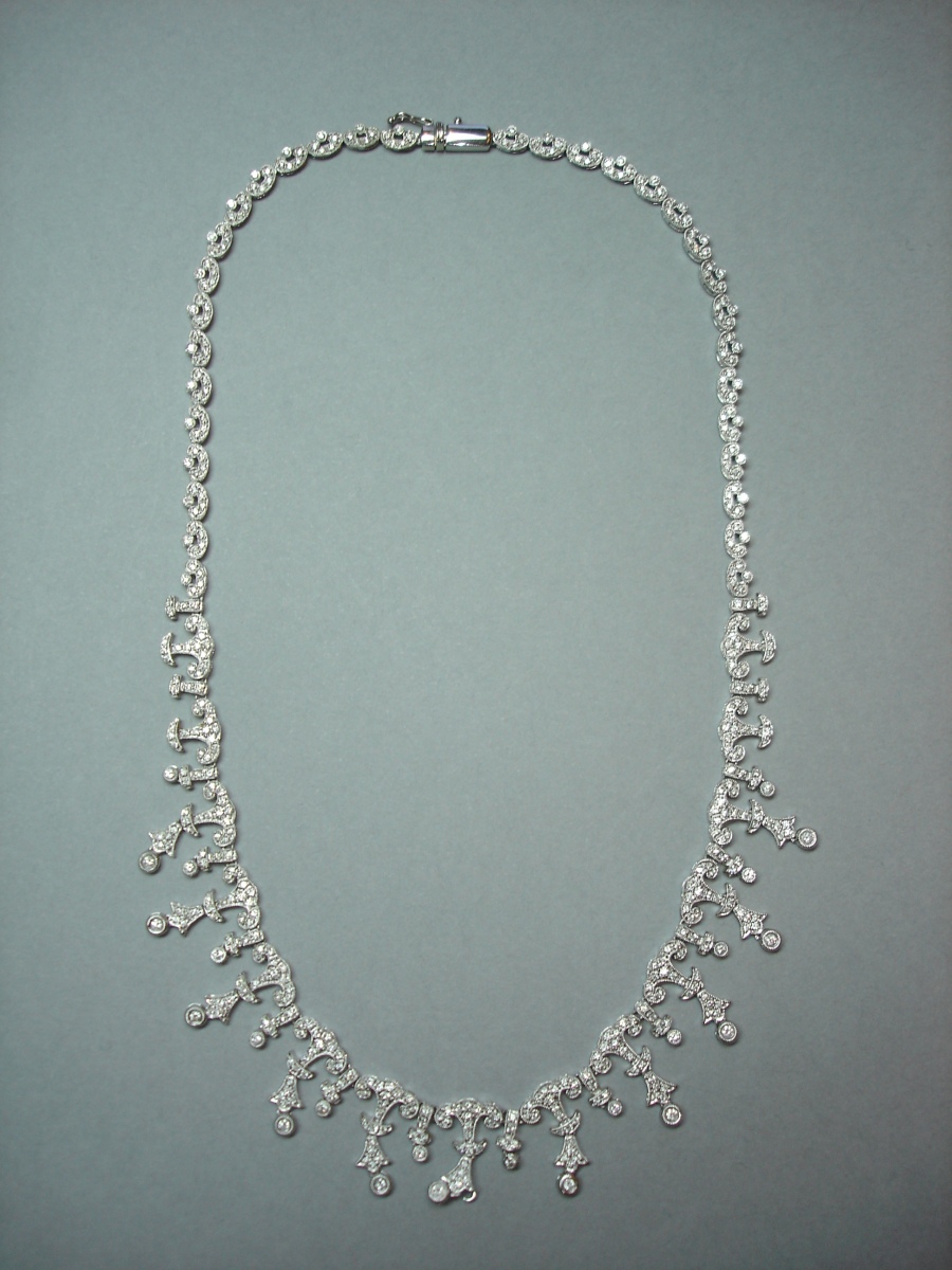COLLIER DRAPERIE en or gris entièrement serti de diamants ronds, les motifs en forme d'arabesques.