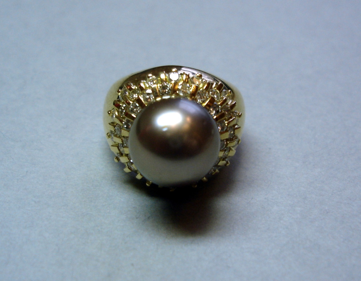 BAGUE BOULE en or jaune ornée d'une perle de culture grise dans un pavage de petits diamants.