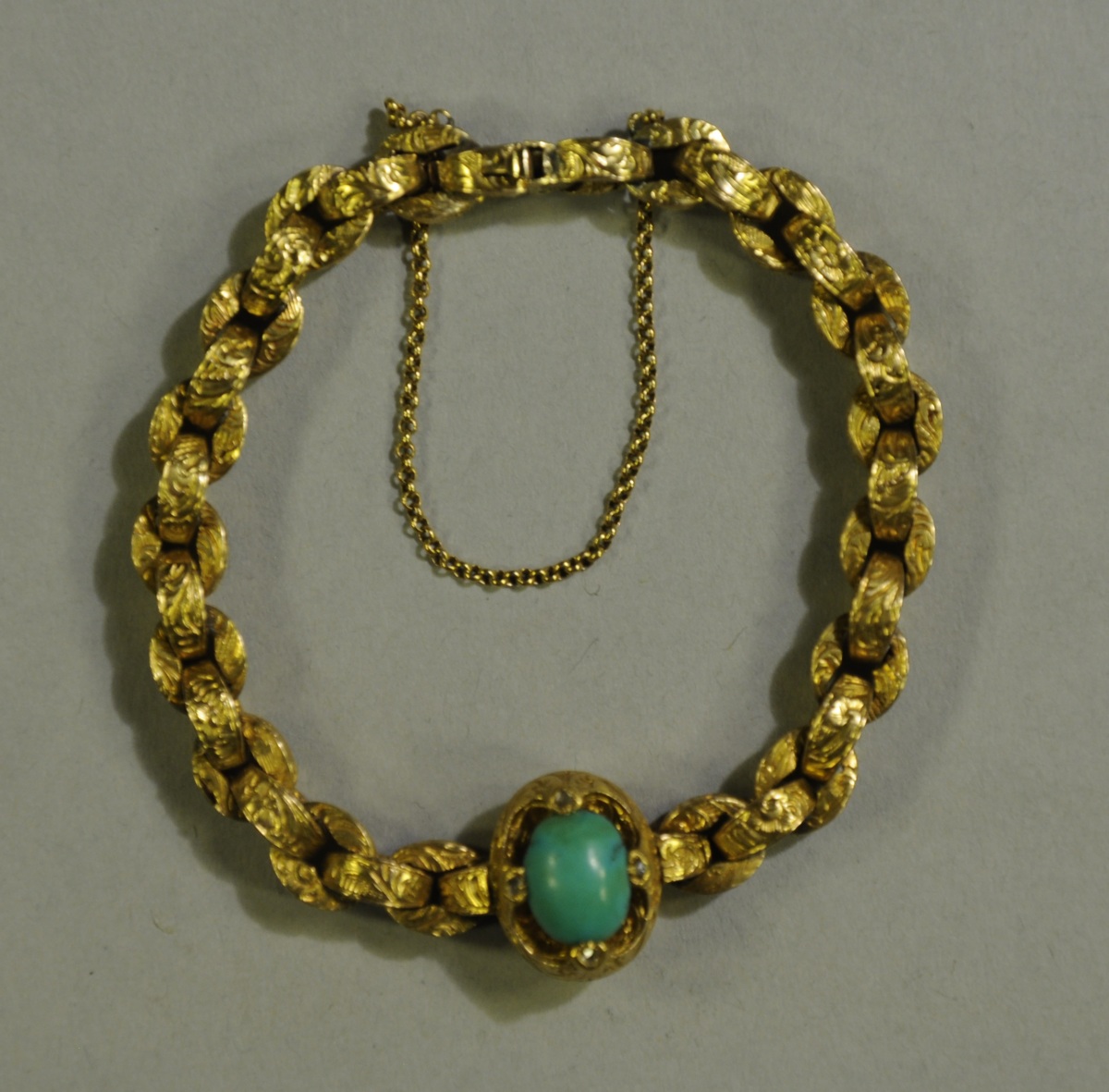 BRACELET en or jaune. Maille souple à décor ciselé de fleurs et feuillages. Il est orné d'une pierre verte. Avec une chaîne de sûreté.