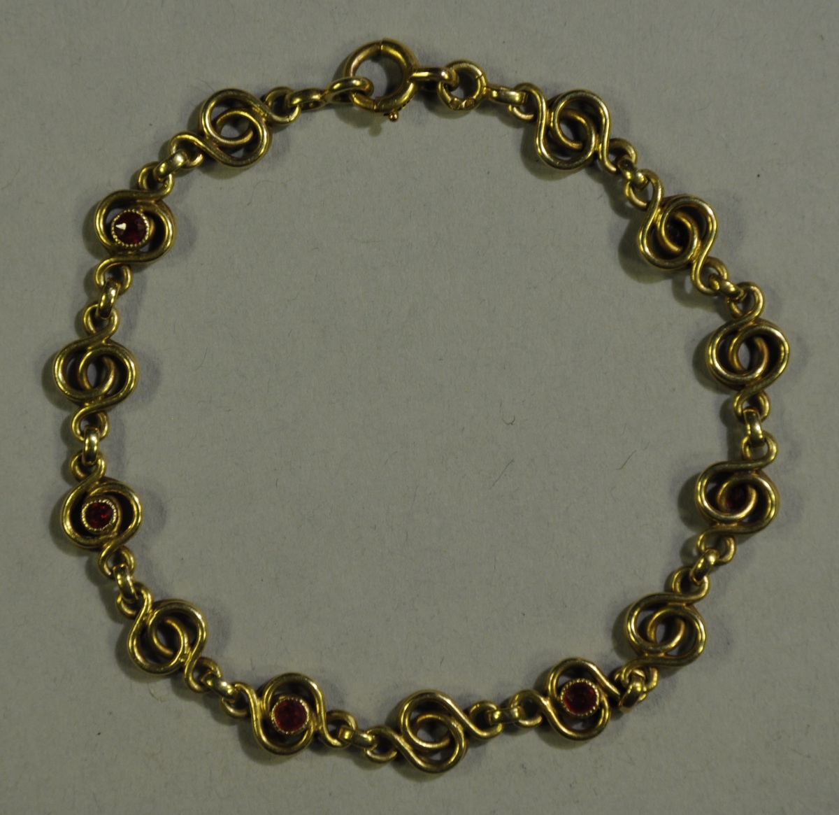 BRACELET souple en or jaune, à motifs d'entrelacs et garni de six petites pierres rouges. Poinçon tête d'aigle.
