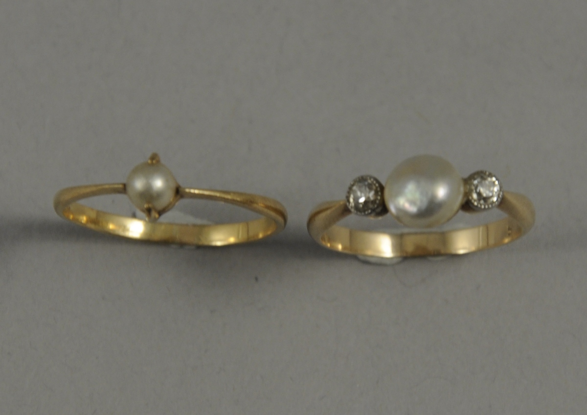 RÉUNION de deux BAGUES en or jaune. L'une est sertie en son centre d'une perle. L'autre est sertie d'une perle entre deux brillants.