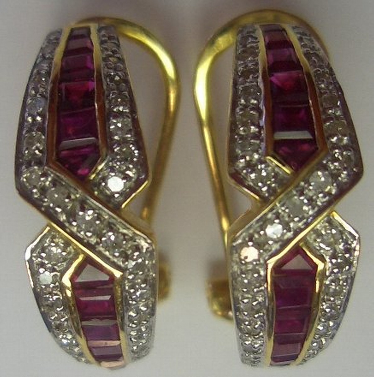 PAIRE de BOUCLES D'OREILLES créoles en or jaune, agrémentées de lignes croisées de 66 diamants blancs de taille moderne pour 0,30 carat, et de 24 rubis calibrés, probablement birmans, pour 1,90 carat. Fermoirs clips avec tiges.