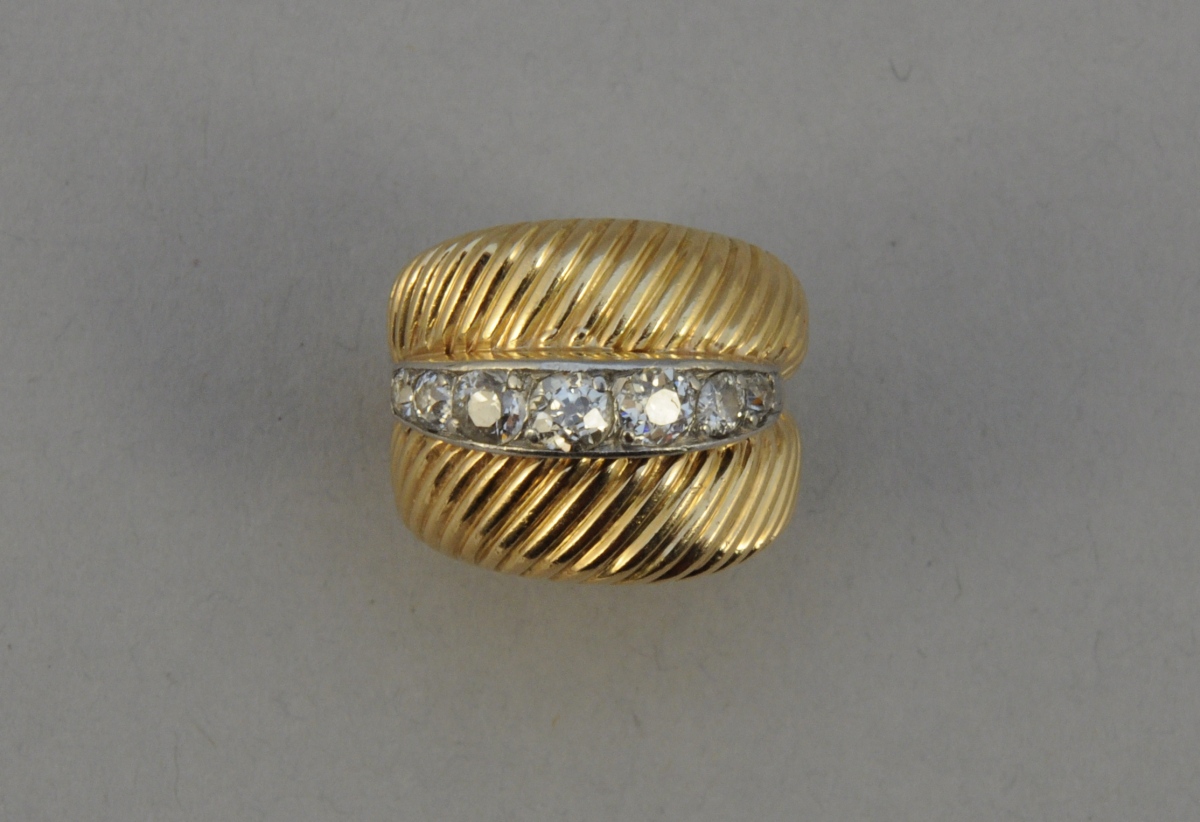 BAGUE deux corps en or jaune décoré de cannelures, ornée au centre d'une ligne de diamants de taille ancienne en chute.