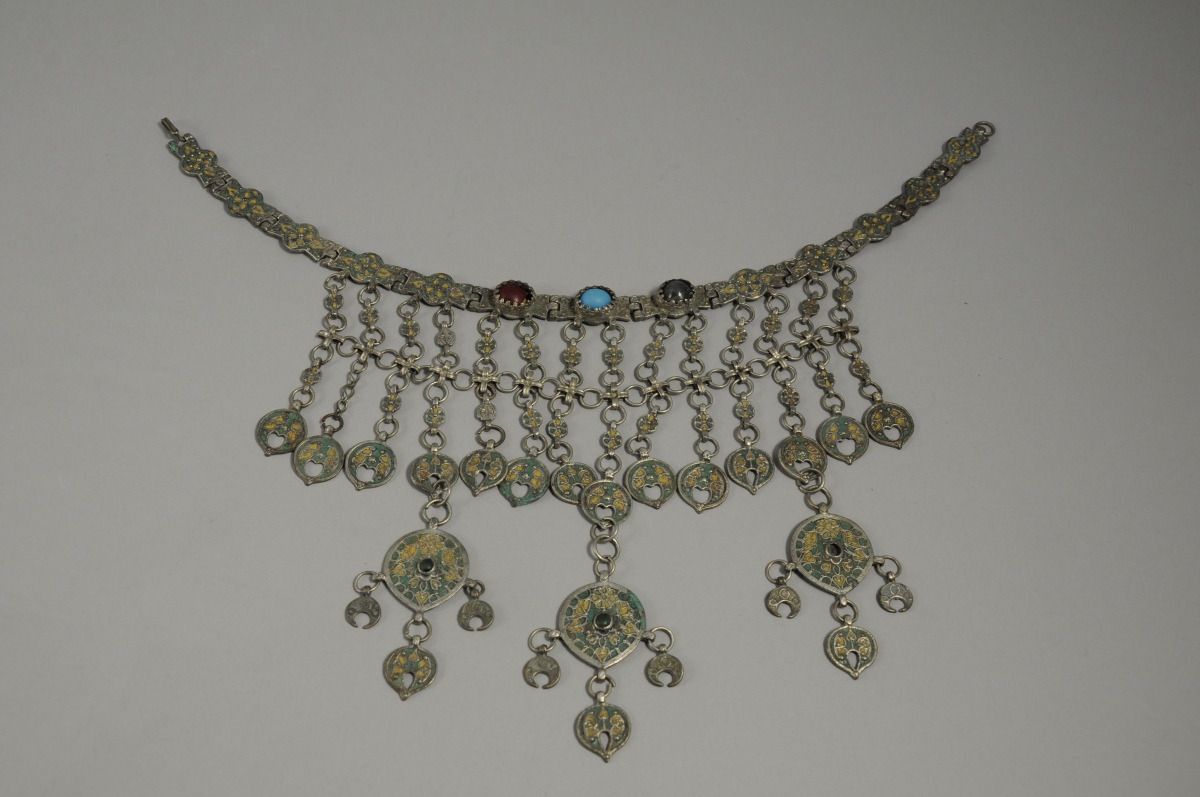 COLLIER en métal partiellement émaillé à pendentifs stylisés, orné de trois cabochons. Travail d'Afrique du Nord.