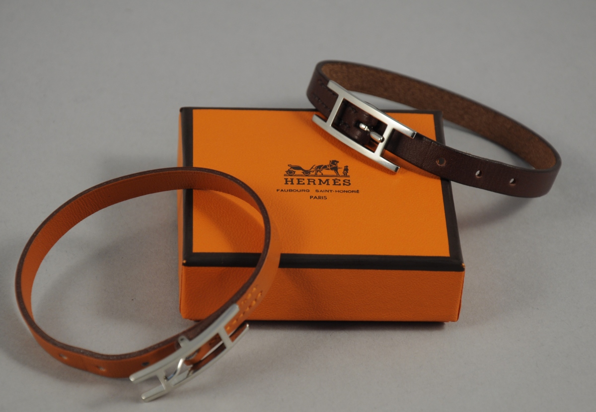 HERMÈS. Deux liens en cuir, l'un marron et l'autre brun. Boucle à la lettre H. Boîte.
