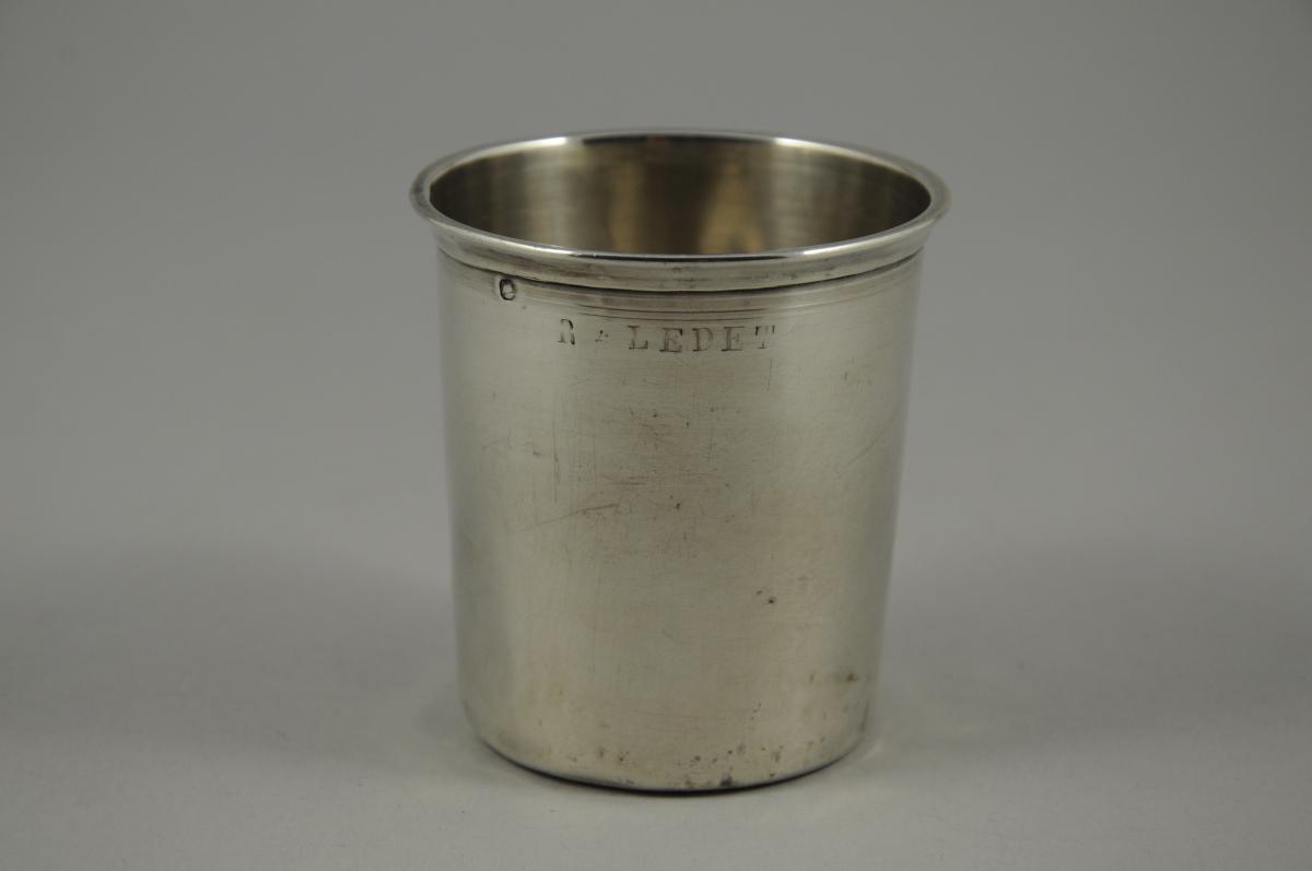 TIMBALE droite dite " de collégien " en argent à décor au double filet. Gravée R. LEDET. Orfèvre " PL ".