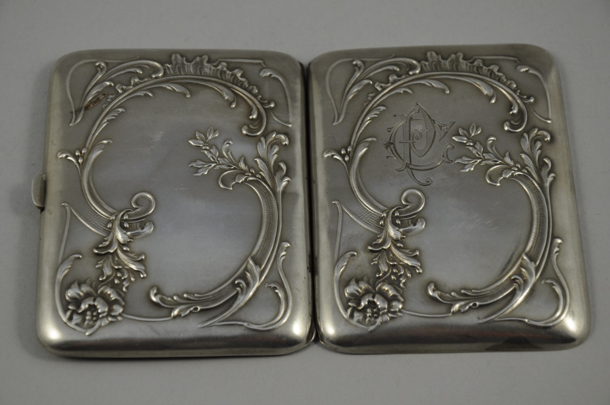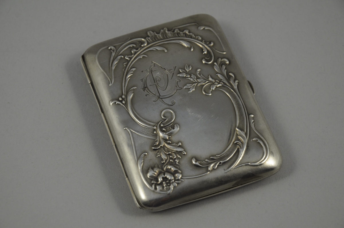 ÉTUI PORTE-CIGARETTES en argent à décor au repoussé de volutes Rocaille fleuries. Monogrammé " P.C ".