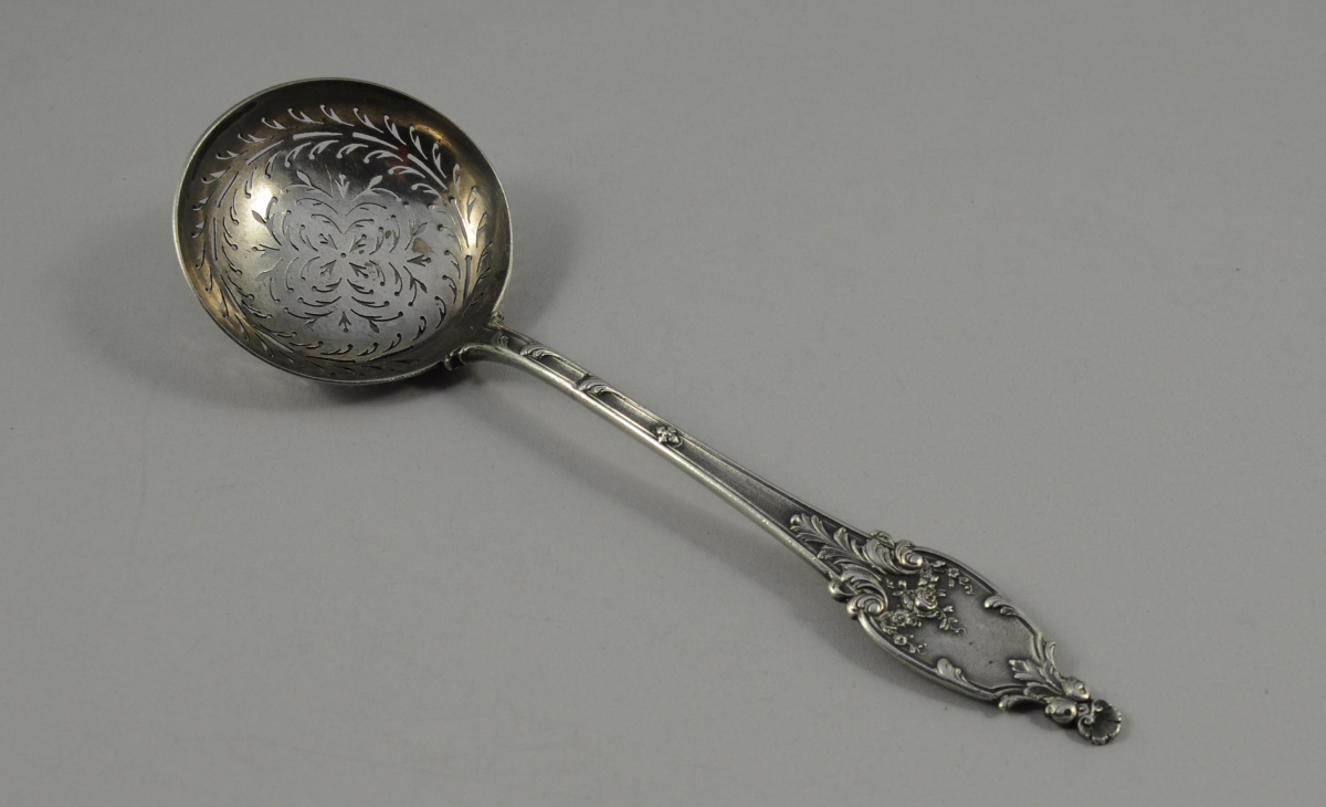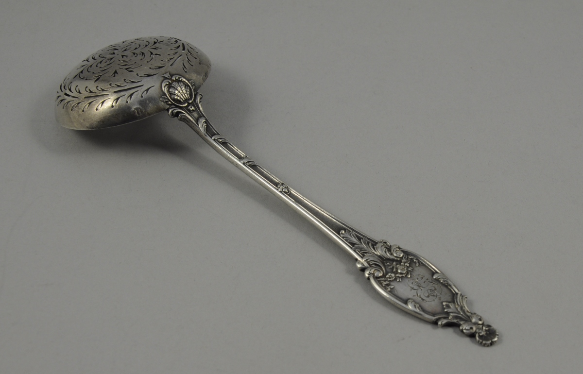 CUILLÈRE À SUCRE À SAUPOUDRER en argent monogrammé. Poinçon Minerve.