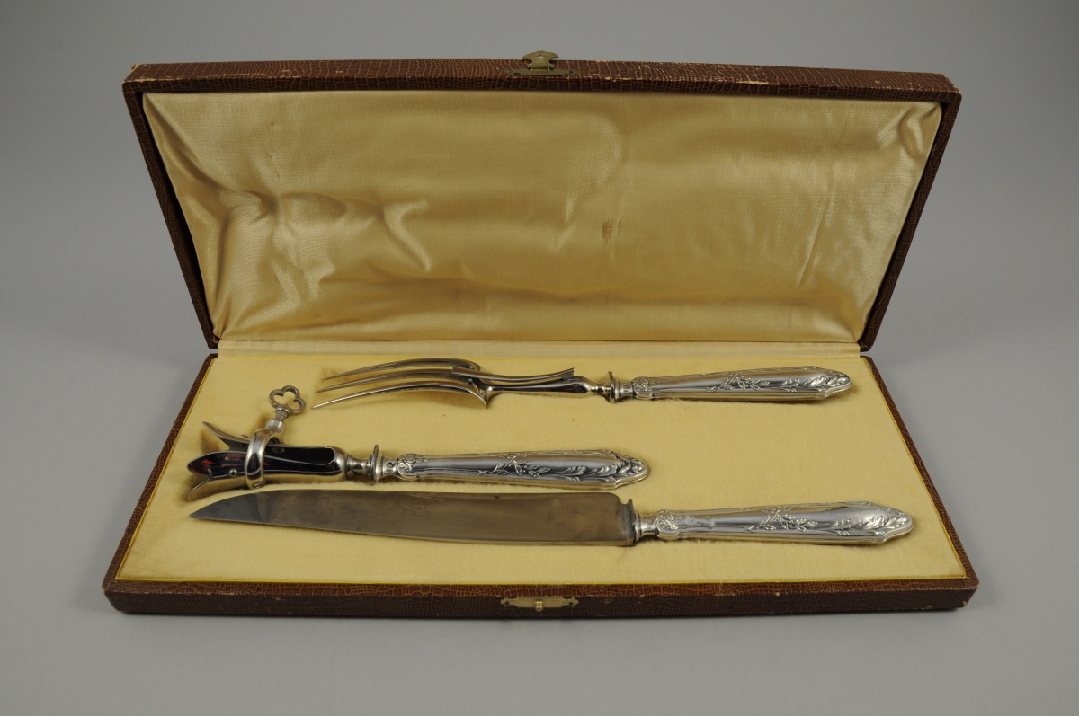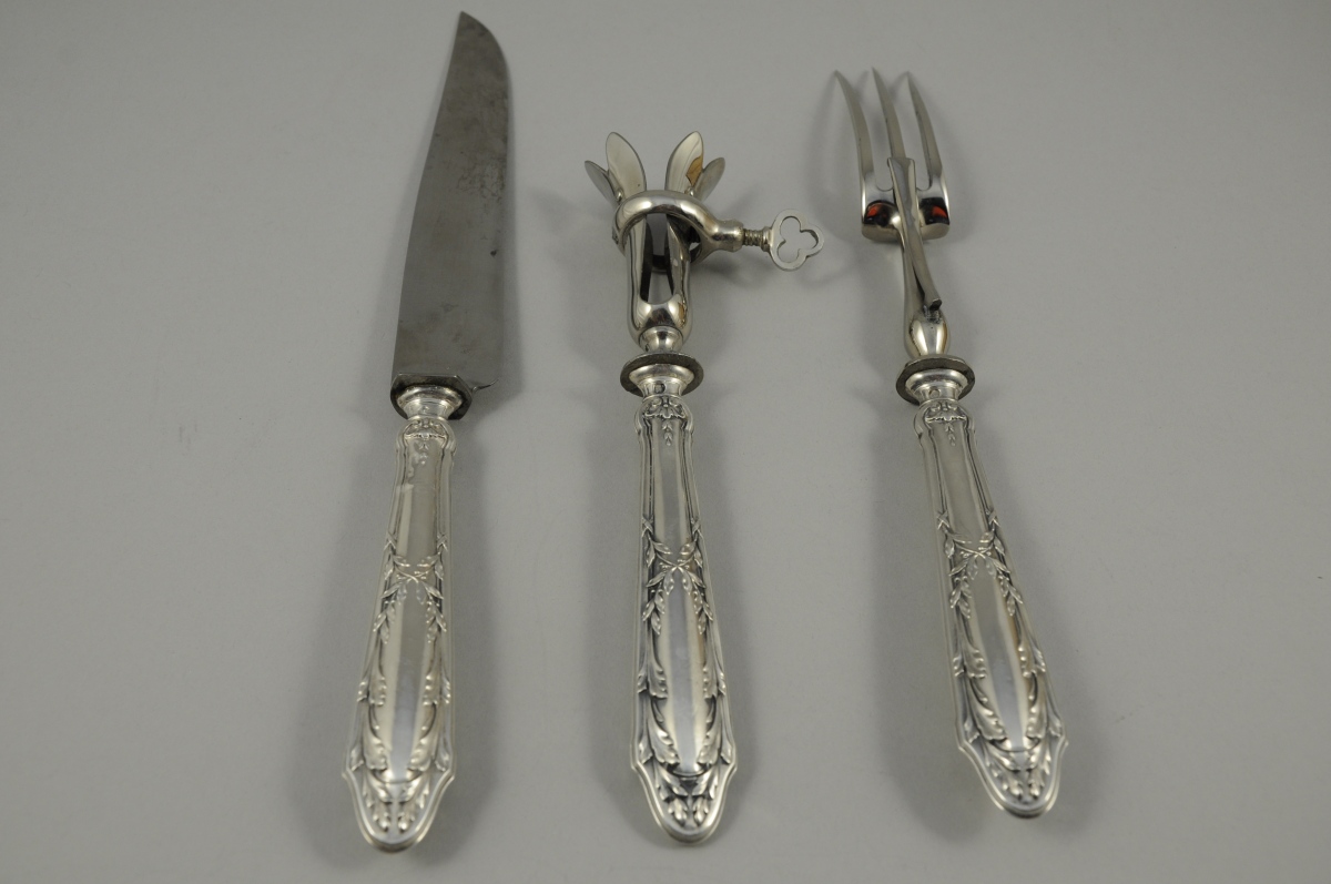 SERVICE À DÉCOUPER comprenant un couvert et un manche à gigot. Manches en argent fourré à décor de palmes, lauriers et joncs rubannés.