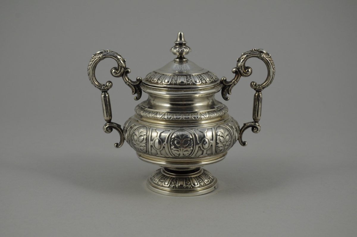 SUCRIER en argent. De forme ronde et pansue, il est décoré au repoussé de cartouches comprenant des motifs végétaux stylisés, de feuilles et de godrons. Couvercle à petit frétel rond, portant le monogramme MA. Anses à cannelures et volutes. Piédouche godronné.