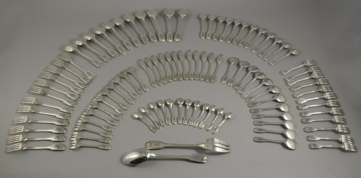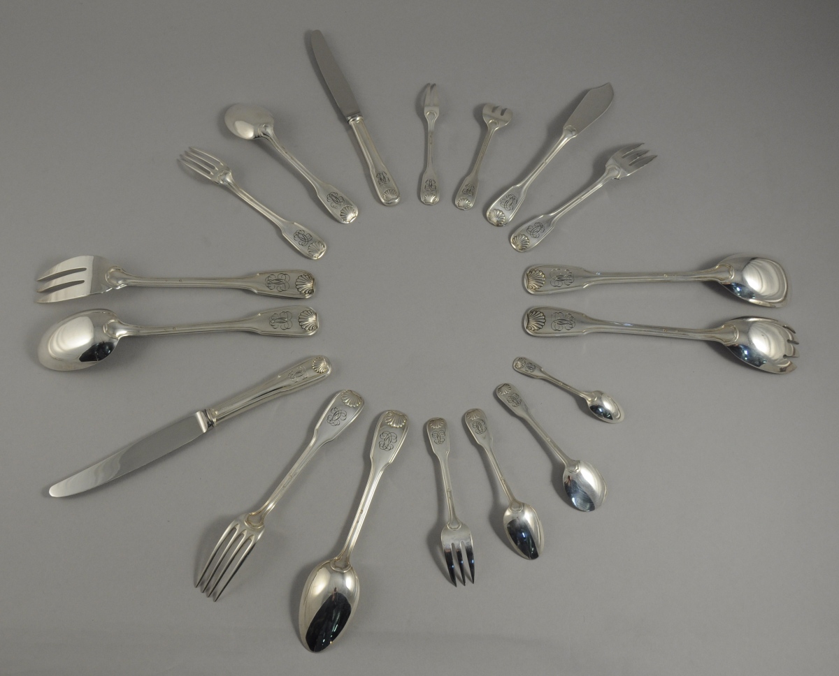 Importante MÉNAGÈRE en argent, modèle coquille. Elle comprend 172 pièces : 12 couverts de table, 12 couverts à entremet, 12 cuillères à café, 12 cuillères à moka, 12 fourchettes à gateaux, 12 cuillères à glace, 12 couverts à poisson, 12 fourchettes à huîtres, 12 fourchettes à escargot, 2 couverts de service dont 1 à salade ; 12 grands couteaux de table, et 12 couteaux à fromage. Initiales gravées.