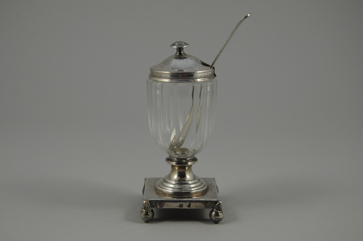 MOUTARDIER en métal argenté à couvercle amovible, le réceptacle en cristal taillé à pans repose sur un piédouche. Base carrée terminée par des pieds boules. Avec sa cuillère.