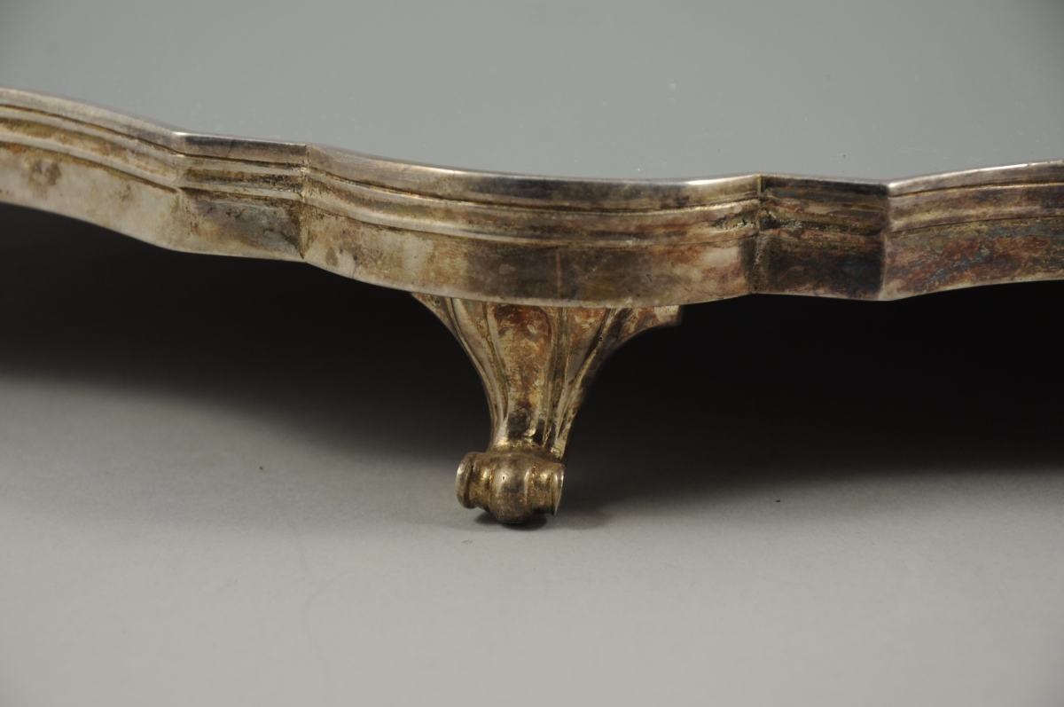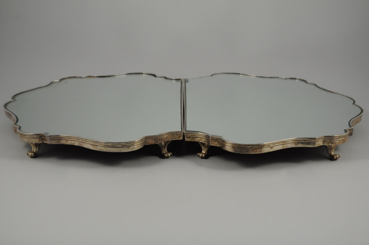 MILIEU DE TABLE en métal argenté en deux éléments, chantourné et foncé d'une glace. Repose sur 8 pieds console terminés par des enroulements.