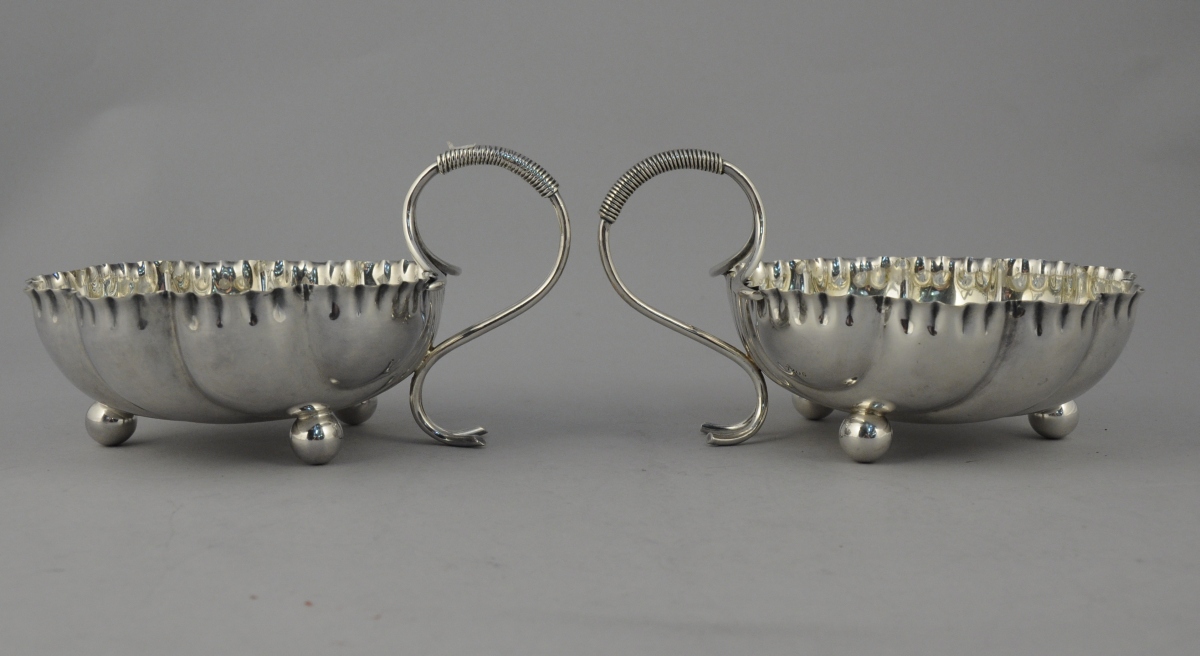 PAIRE de COUPES "coquille" en métal argenté. Elles reposent sur trois pieds boule, anse en volute. Dim. hors tout : Haut. 12,5, Long. 22, Larg. 18 cm chaque.