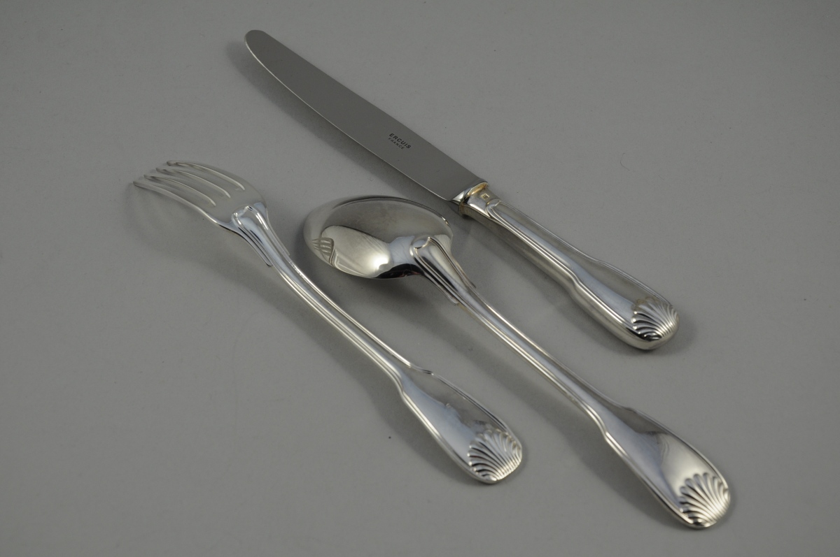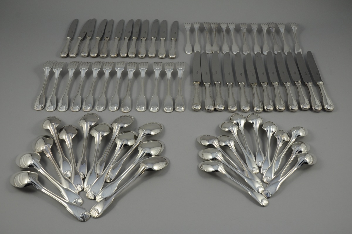 MÉNAGÈRE en métal argenté, modèle coquille, comprenant 72 pièces : 12 couverts de table, 12 gands couteaux de table, 12 couverts à entremets, 12 couteaux à fromage.