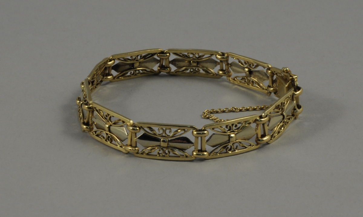 BRACELET en or de deux tons, à motifs rectangulaires enchassant une figure géométrisée dans des enroulement. Long. 19 cm. Poids : 15 g.