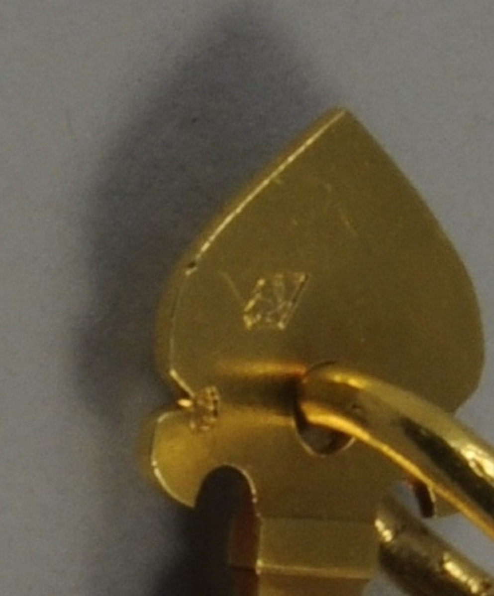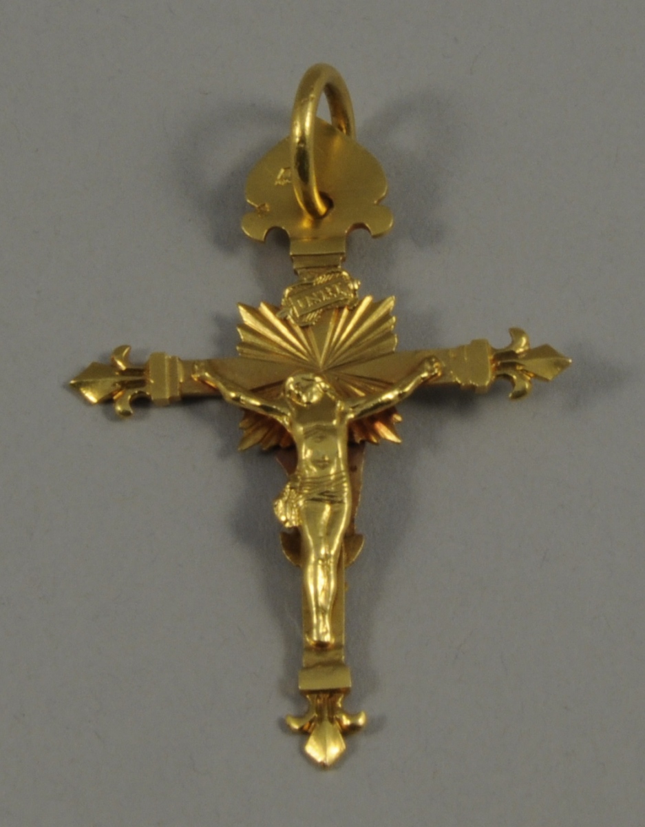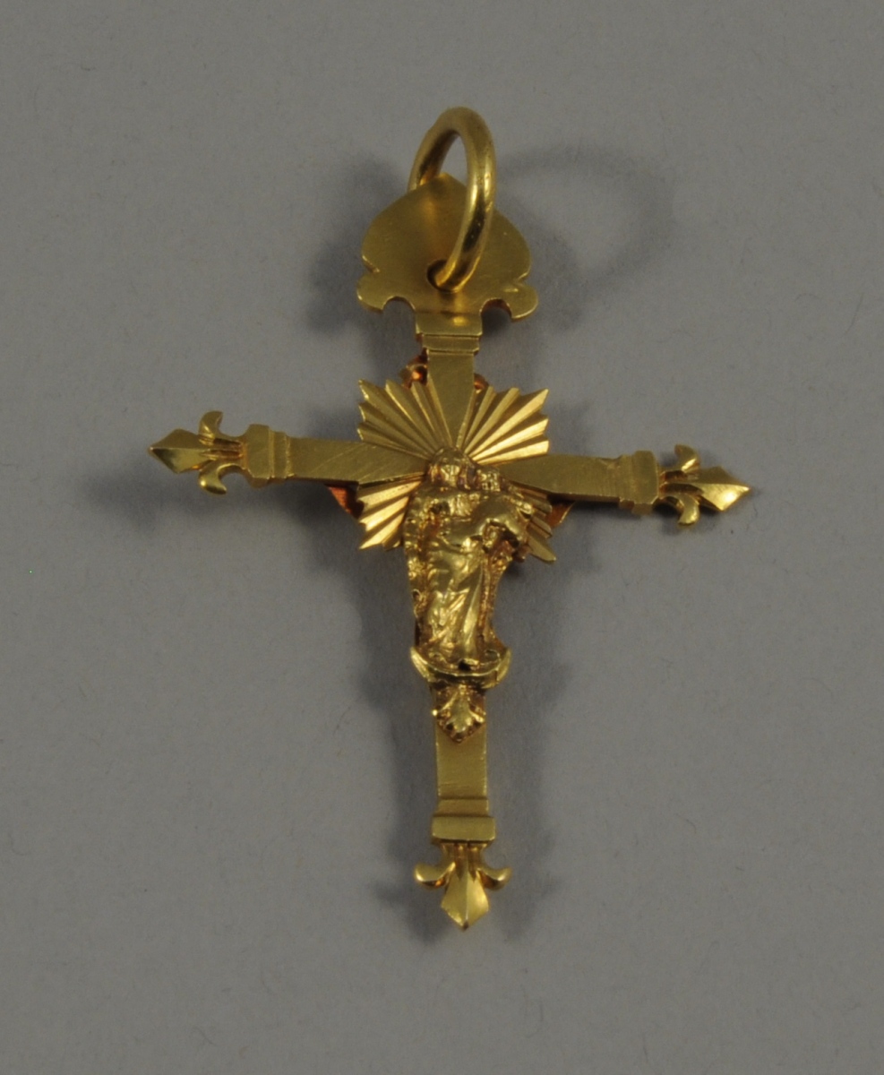 CROIX pendentif en or représentant Le Christ sur une face et La Vierge à l'Enfant sur l'autre face. Long. 6 cm. Poids : 10,3 g.