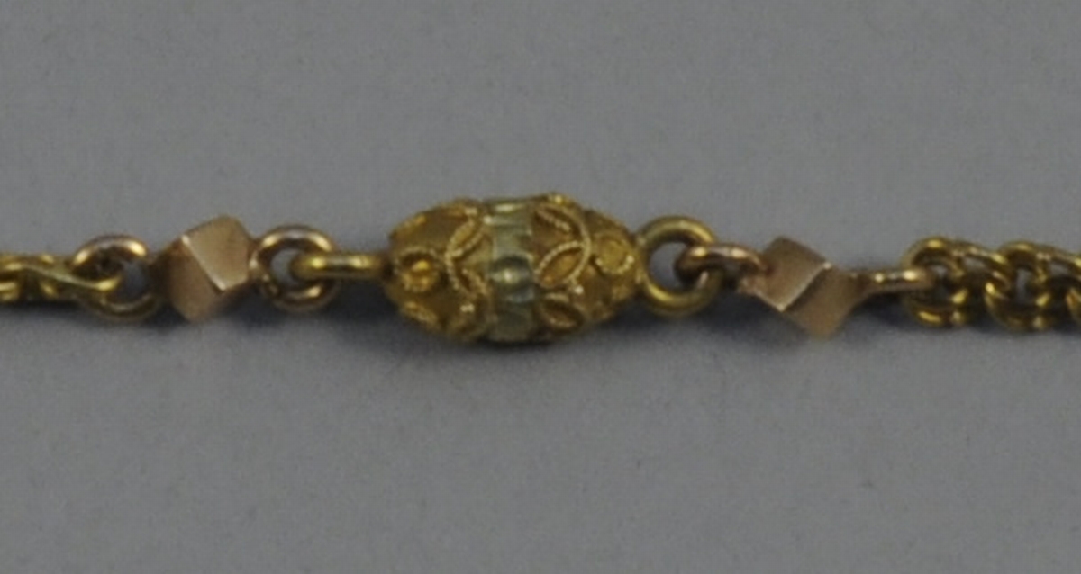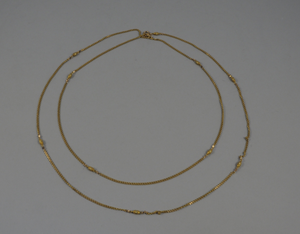 Beau SAUTOIR ancien en or. Chaine entrecoupée de motifs décoratifs en or de 2 tons en forme de navette retenus par des cubes. Long. 150 cm. Poids : 29,3 g.