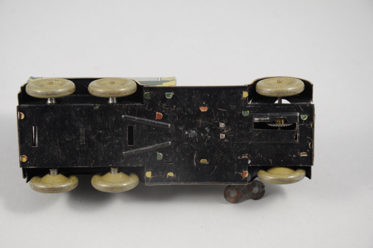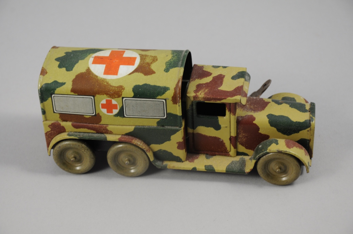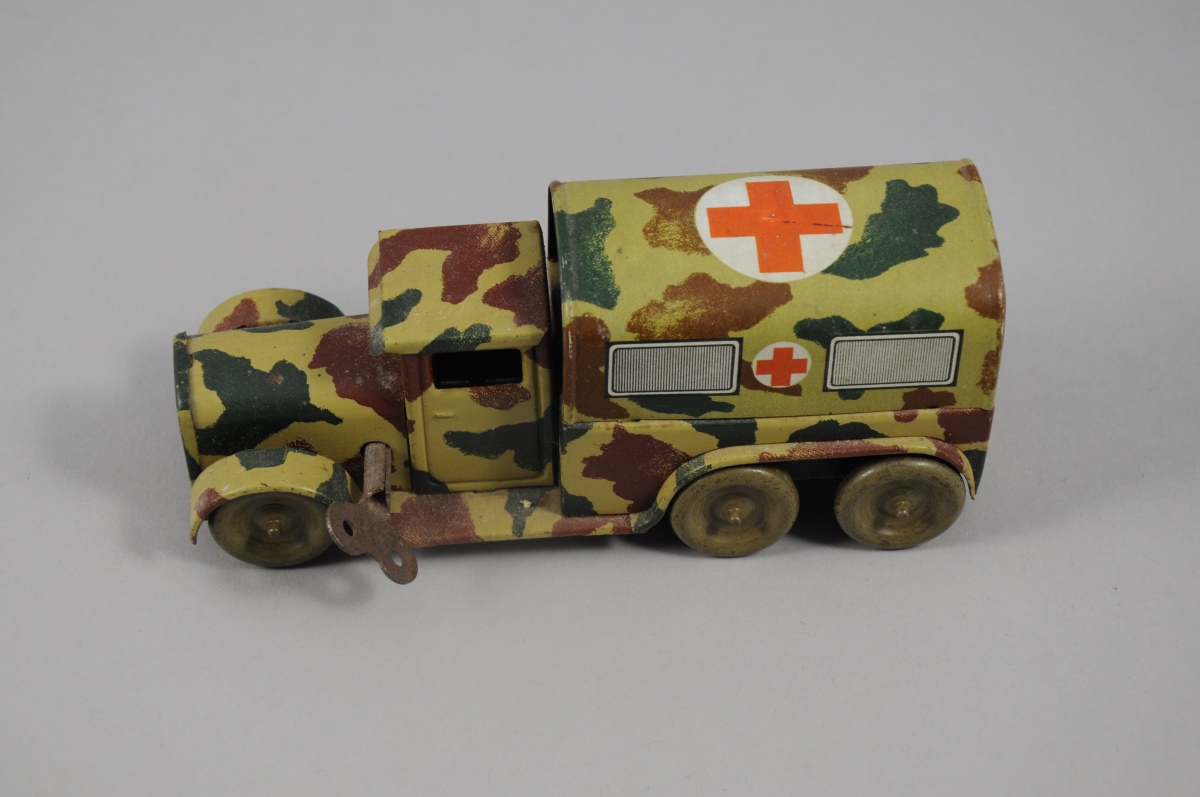 ALLEMAGNE. Ambulance en tôle. Mécanique. Lithographiée moutarde et tâchetée marron et vert.