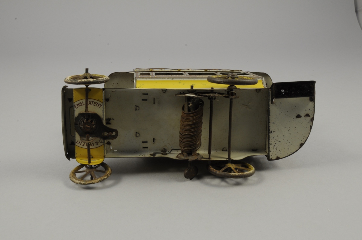 « LEHMANN'S AUTOBUS », (Allemagne, c. 1907). Jouet mécanique représentant un autobus à impériale avec chauffeur couleur jaune et brune. Modèle n°590 de la maison Lehmann. État d'usage (manque une partie de la roue avant droite).