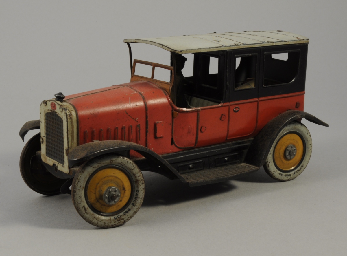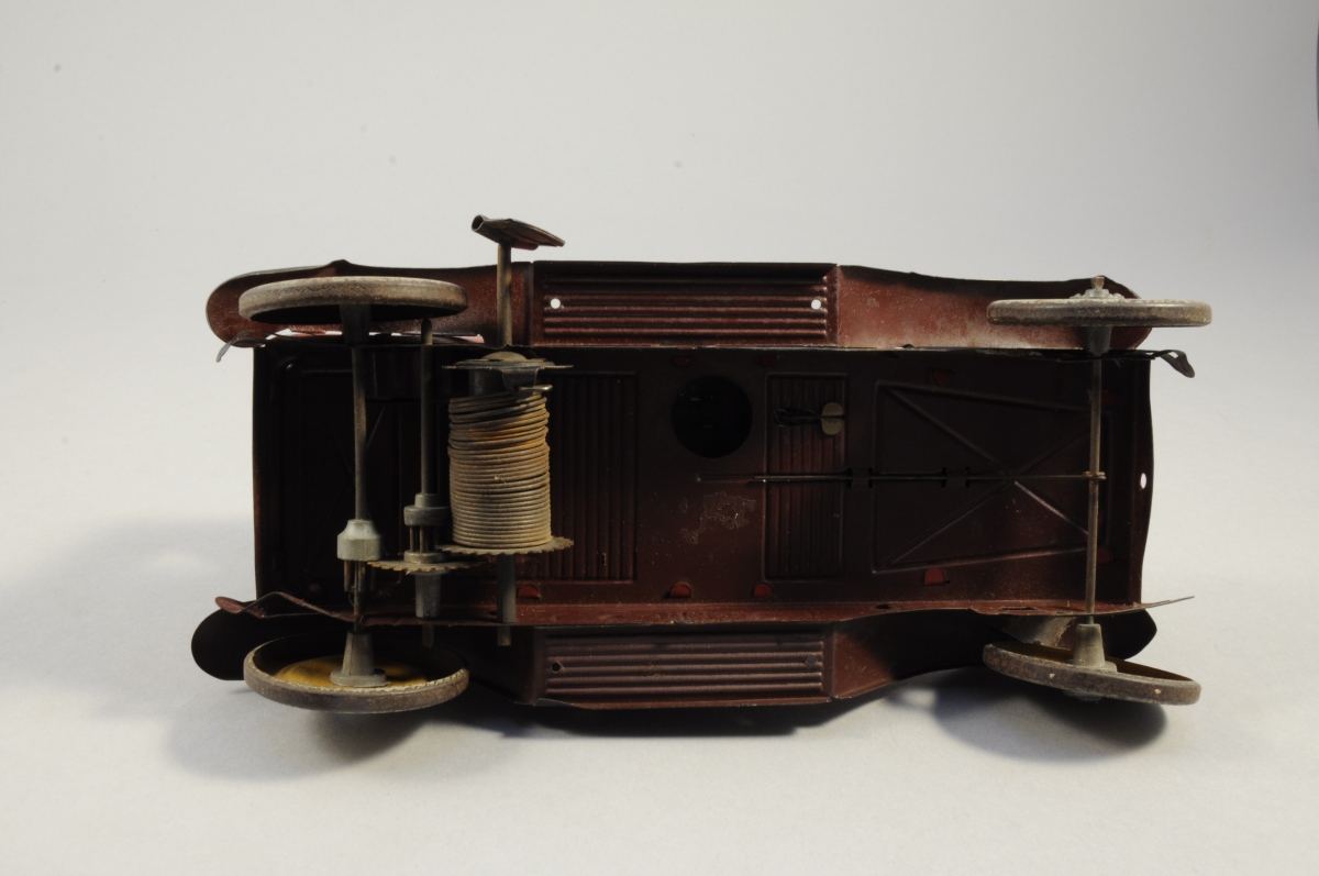 C.R. (ROITEL - ROSSIGNOL & CIE). VOITURE avec chauffeur en tôle peinte en noir, rouge et blanc, marquée en relief "C.R.". Avec une malle en carton d'origine. Mécanisme entraîneur.