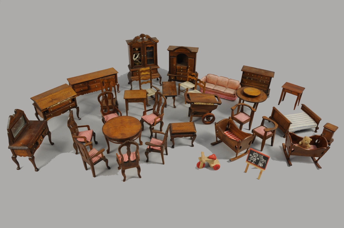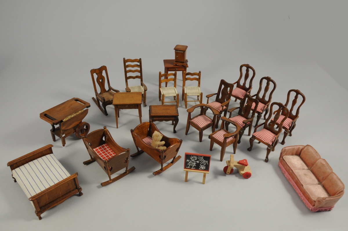 AMEUBLEMENT DE POUPÉE en bois verni : buffet-vitrine, cabinet., secrétaire à abattant, commode, enfilade, 6 tables, desserte, 6 fauteuils, 2 chaises tressées, 2 chaises, canapé, 2 rocking-chair, lit, coiffeuse, chevet, 2 lits d'enfant.