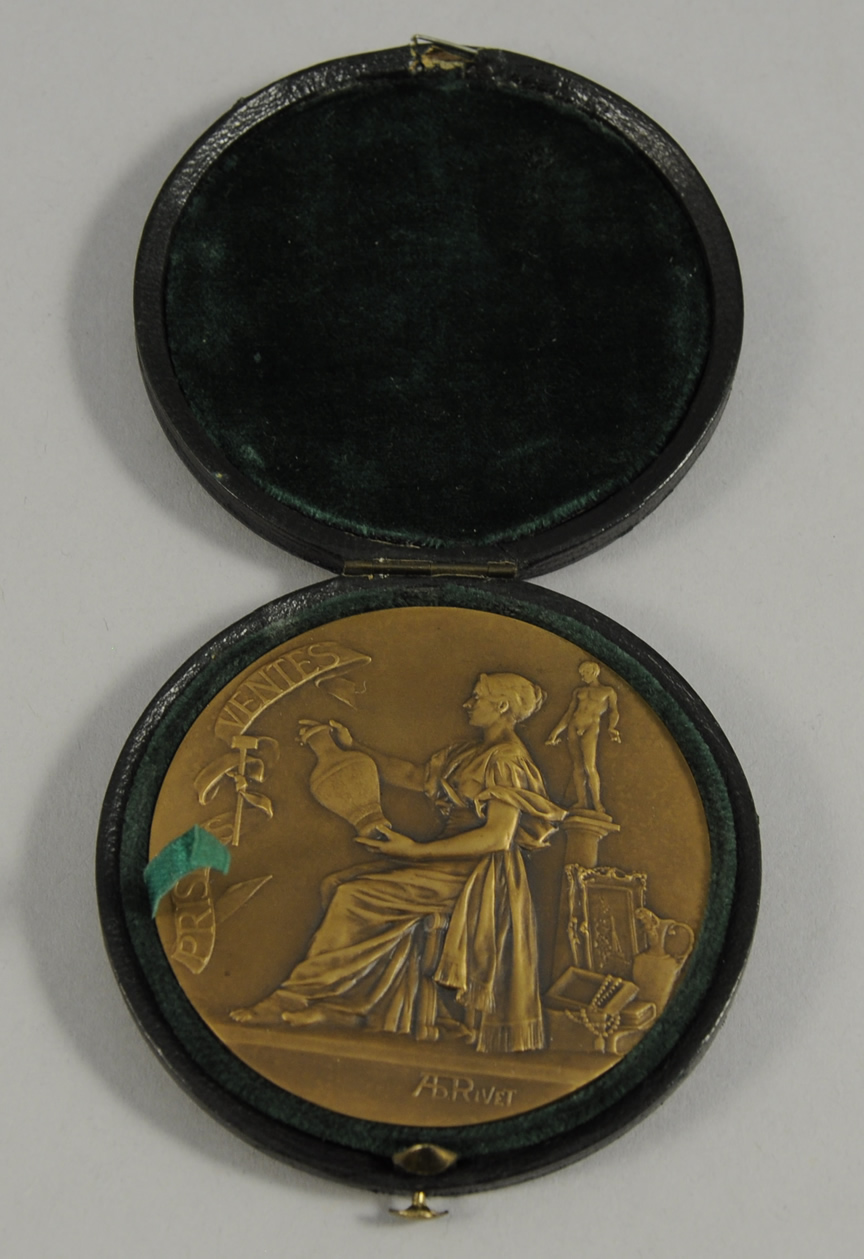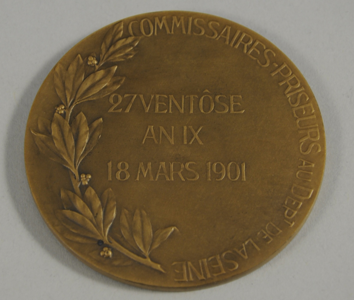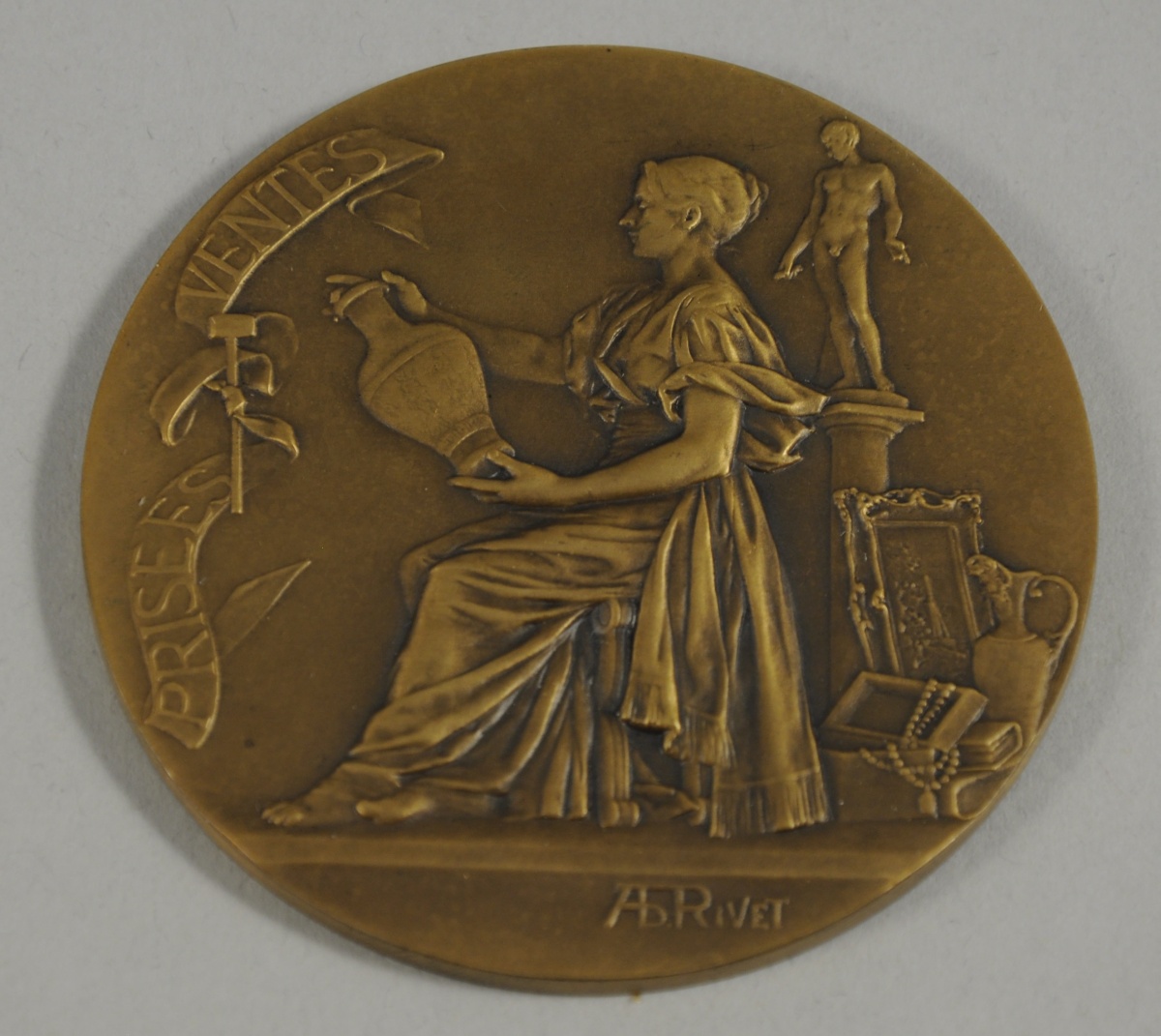 RIVET. MÉDAILLE de table en bronze. Recto figurant une jeune femme étudiant des objets anciens, allégorie des "Prisées" et "Ventes". Verso marqué "Commissaires-priseurs au Dept de la Seine 27 Ventôse an IX 18 mars 1901". Signée en bas au recto.
