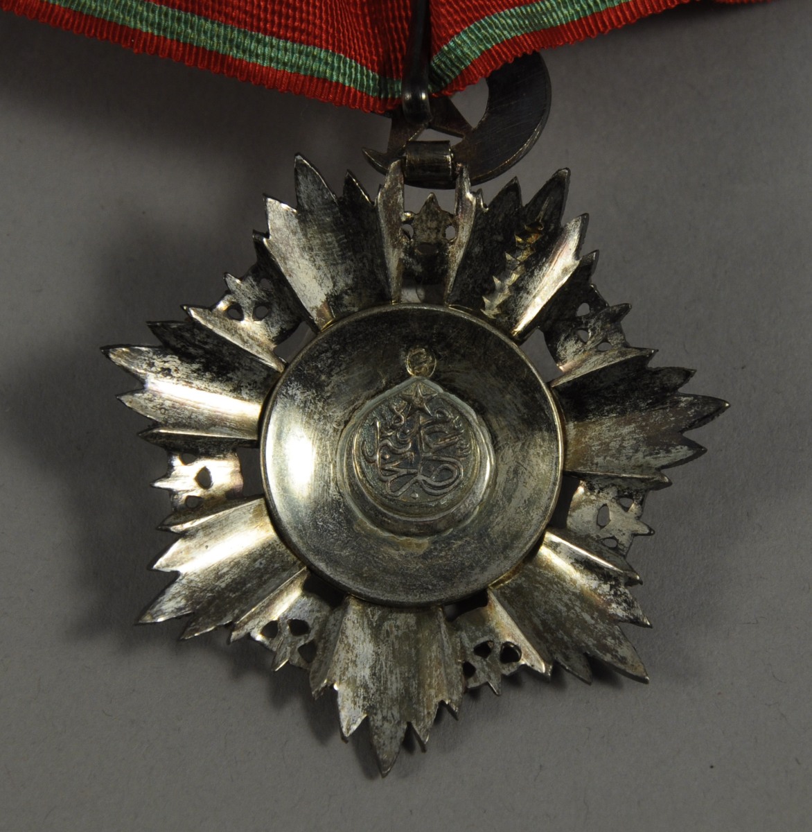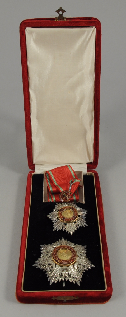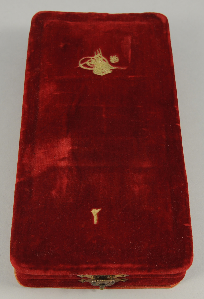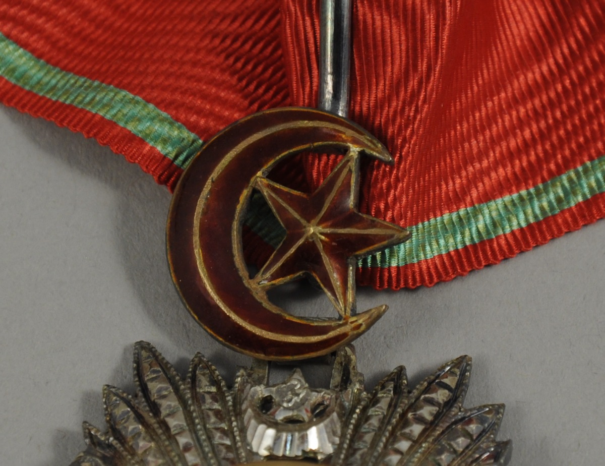 Ensemble complet de 2e classe, comprenant une étoile et une plaque, les deux en argent, à sept rais décorés de pointes de diamant, anglés d'un croissant et d'une étoile, le médaillon central en or est frappé de la tughra du sultan Abdul-Medjid et bordé de la légende de l'ordre en turc sur quatre cartouches émaillés rouges : PATRIOTISME - ZELE - LOYAUTE - 1268 (1852) ; l'étoile est sommée d'un croissant en or émaillé qui forme la bélière de suspension dans laquelle passe la cravate complète ; sur les dos figurent les poinçons de la Monnaie Impériale ; dans un écrin en velours de soie grenat frappé de la tughra du sultan et du chiffre 2.