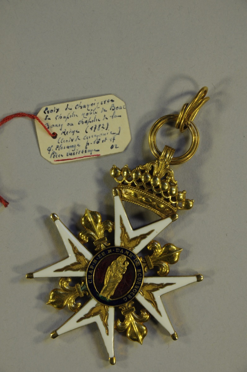 L'abbaye bénédictine de Notre-Dame de Bourbourg, située en Flandre dans le diocèse de Saint-Omer, fondée vers 1100, reçut en 1782 la protection de la reine Marie-Antoinette, dès lors les religieuses prirent le titre de " chanoinesses comtesses ", la reine devint première chanoinesse et l'abbaye " chapitre de la Reine ". À cet insigne honneur s'ajouta celui de pouvoir porter, suspendue à un ruban de soie jaune bordé de noire, une croix d'or à huit pointes, portant d'un côté l'image de la Vierge et sur l'autre le profil de la reine. Lors de leur réception solennelle les chanoinesses recevaient deux croix, une grande et une petite. La grande, portée en chur, était réservée aux cérémonies, la petite à l'usage quotidien.
