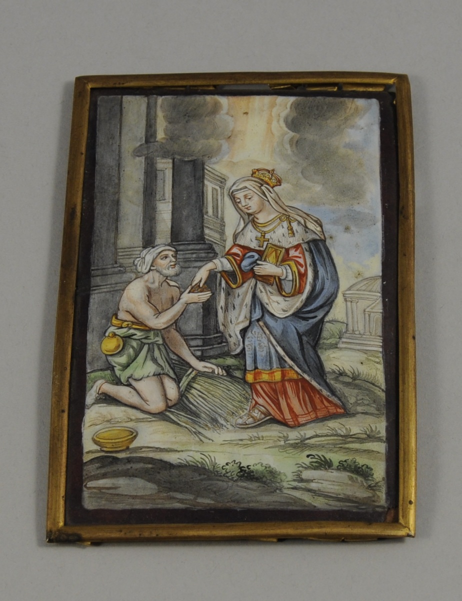Plaque d'ÉMAIL PEINT : Reine faisant l'aumône à un pauvre (sainte Adélaïde ?).