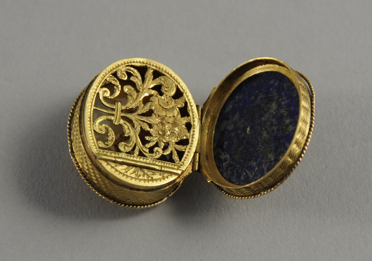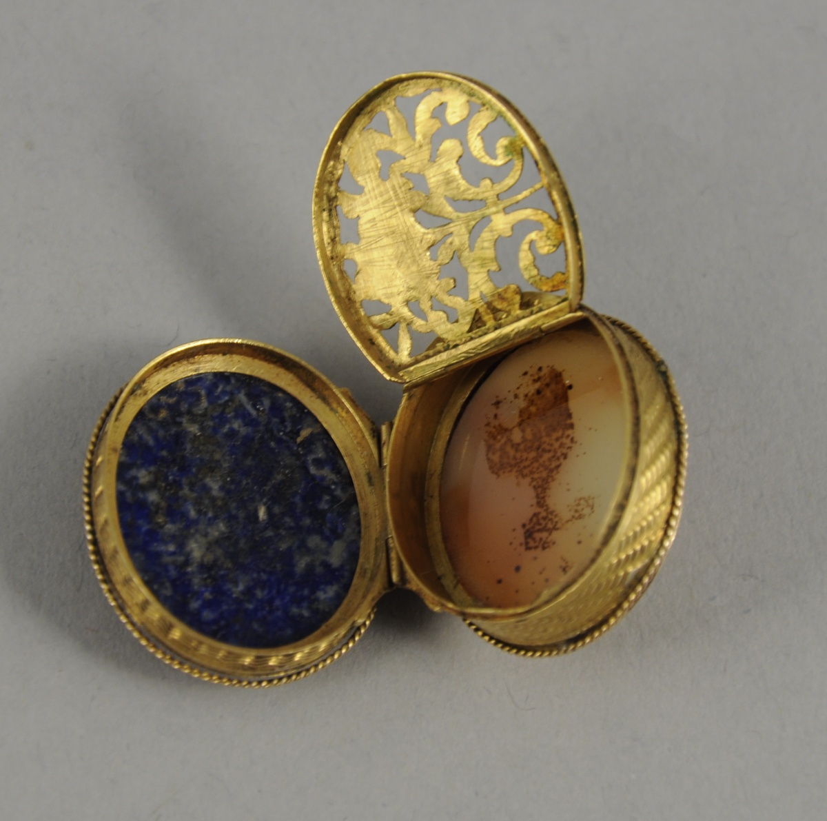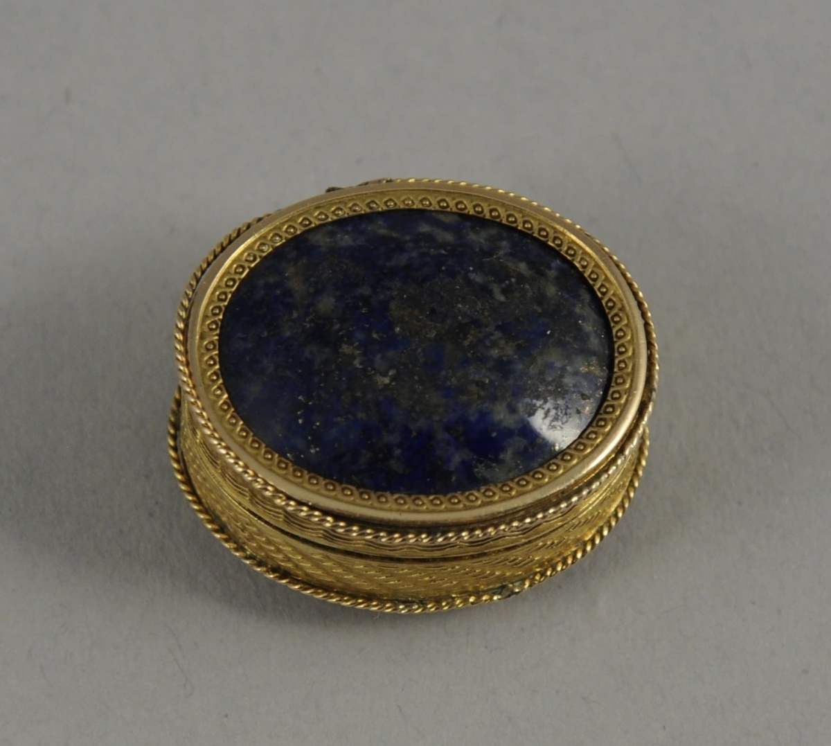 BOÎTE à MOUCHES ovale en or guilloché, lapis-lazuli et cornaline. Le compartiment intérieur fermé par une cloison ciselée et ajourée à décor d'un bouquet de fleurs et volutes.