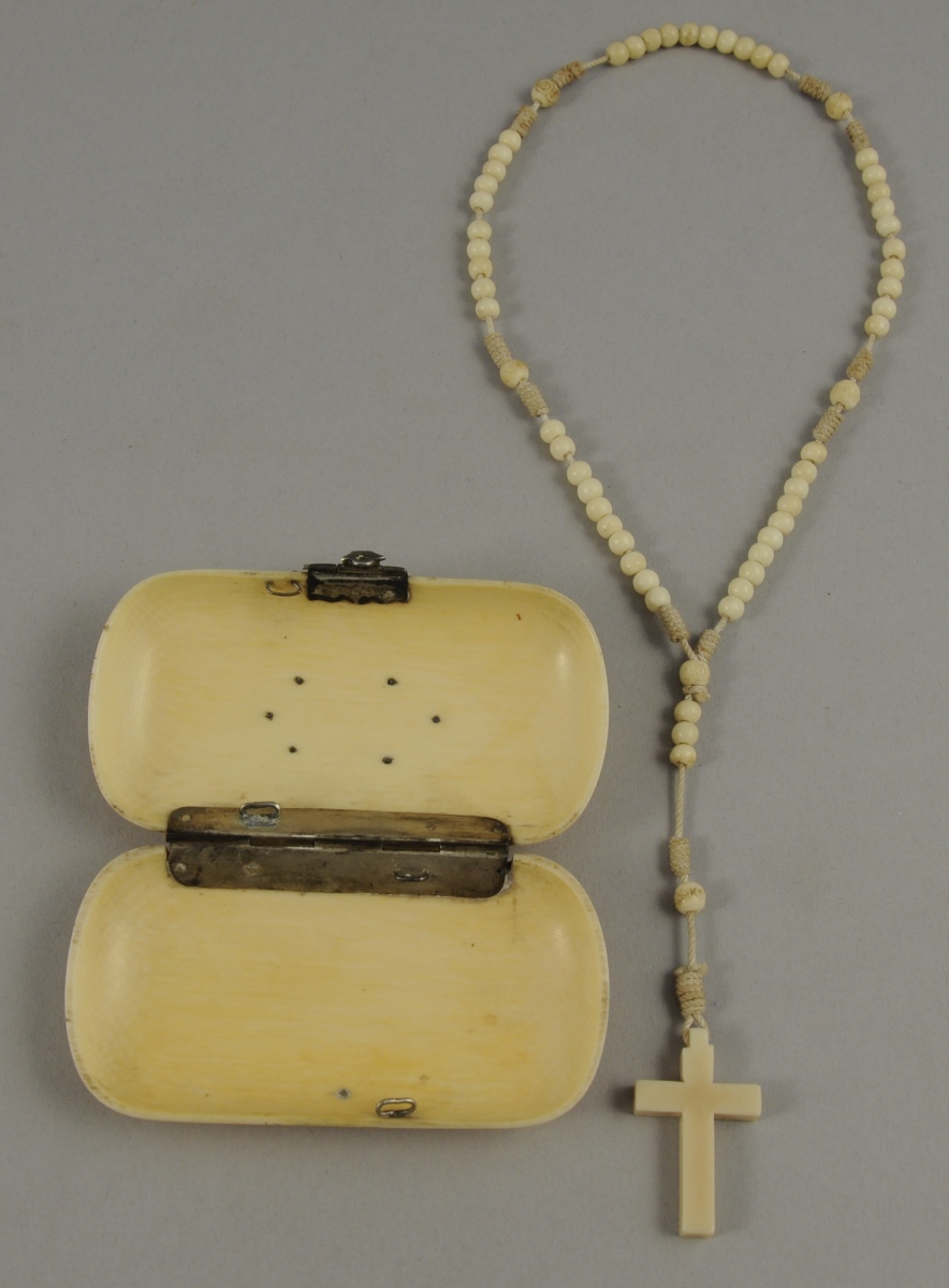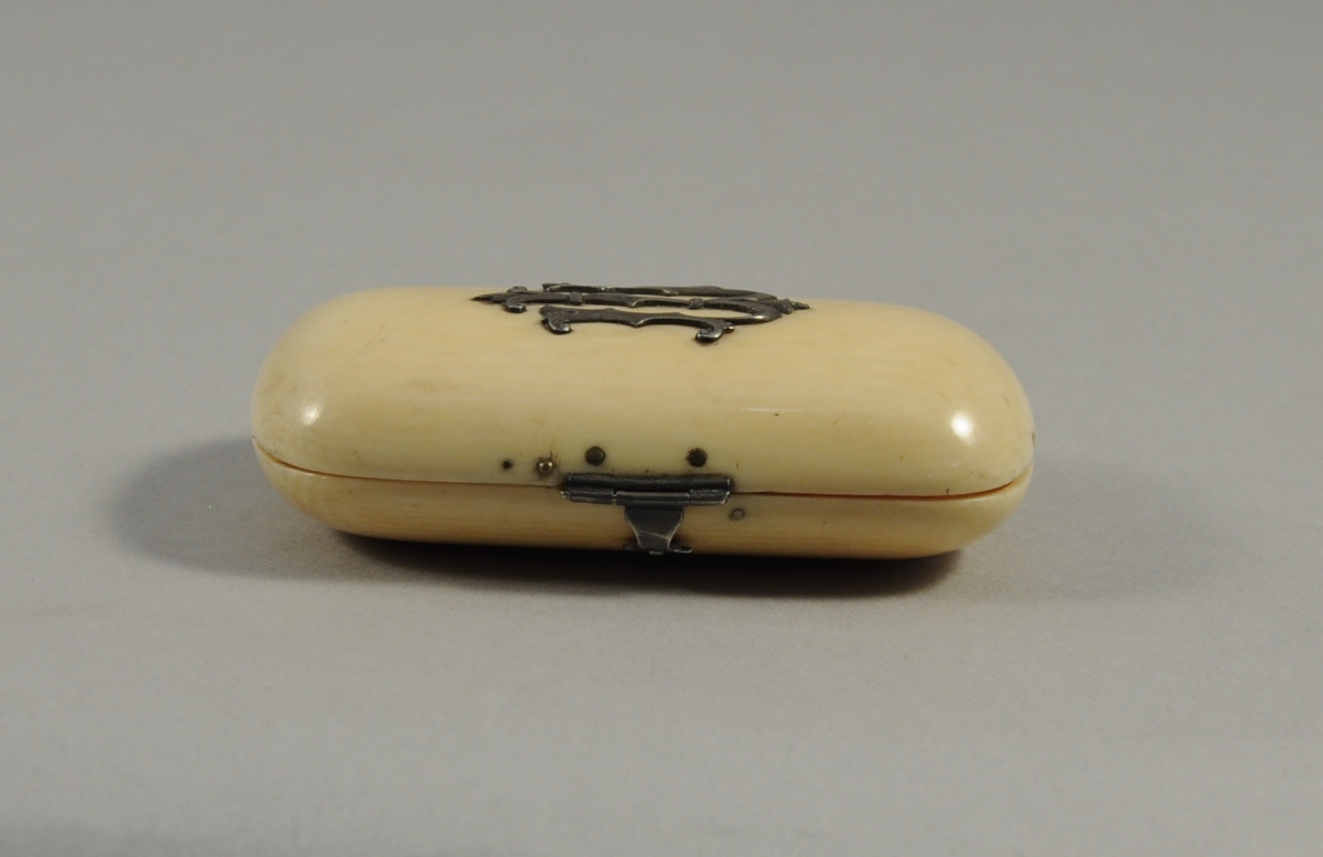 BOÎTE de forme rectangulaire à profils arrondis en ivoire. Monogramme M en métal appliqué sur le couvercle.
