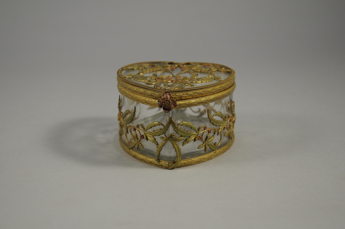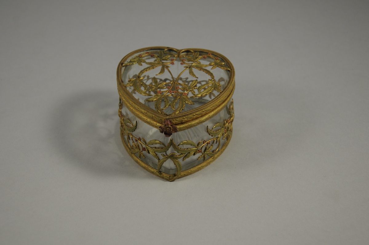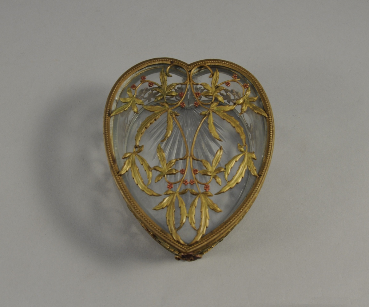 BOÎTE en forme de coeur en cristal taillé. Riche monture en métal doré et patiné de vert et de rouge. Décor de résille de branches, fleurs et baies.