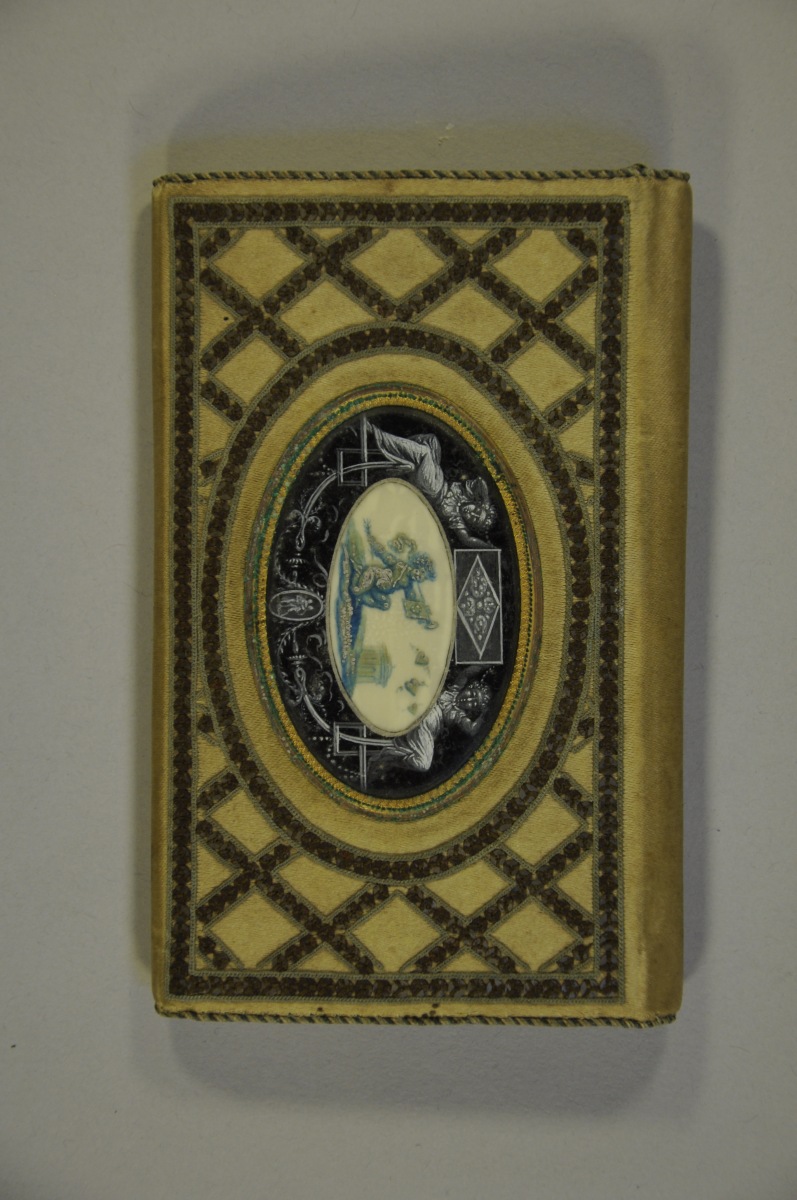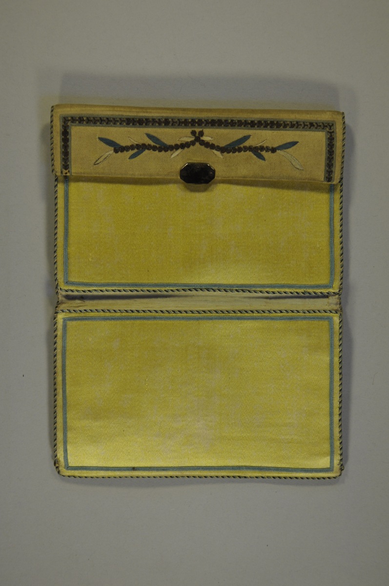 PORTEFEUILLE en soie jaune avec fermeture à rabat et deux pochettes intérieures. Le plat portant le fermoir est agrémenté de deux guirlandes de feuillages. L'autre plat porte, dans un entourage quadrillé de paillettes, une peinture en fixé sous verre, figurant Cupidon soufflant dans une trompette près du temple de l'Amour, sur fond peint en grisaille.
