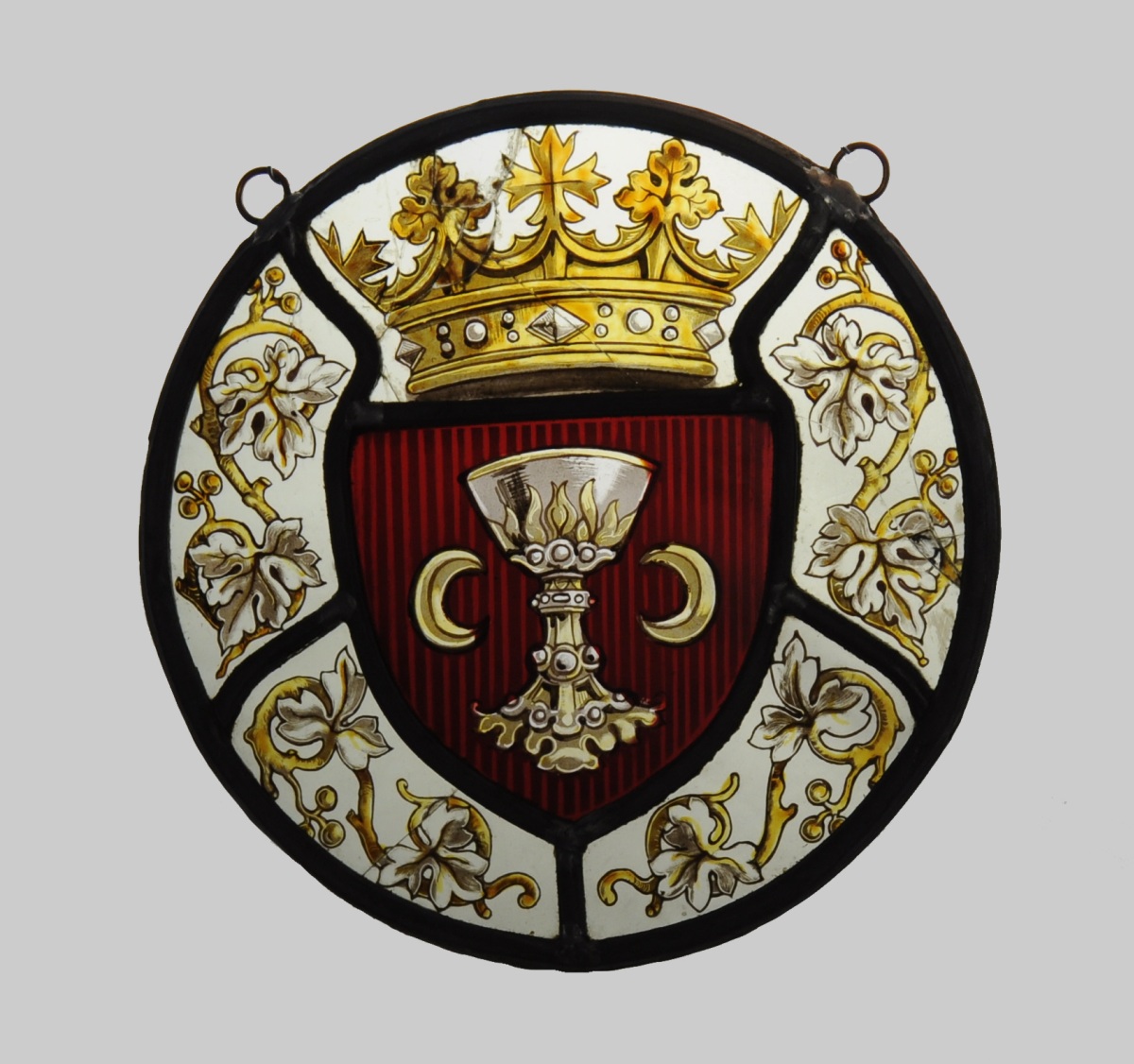 VITRAIL de forme ronde, en verre peint ceint de plomb. Il représente des armoiries, un calice et deux croissants sur fond de gueules, surmontées d'une couronne marquisale, et entourées de pampres de vigne.