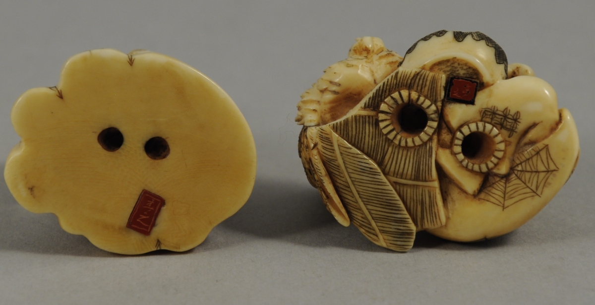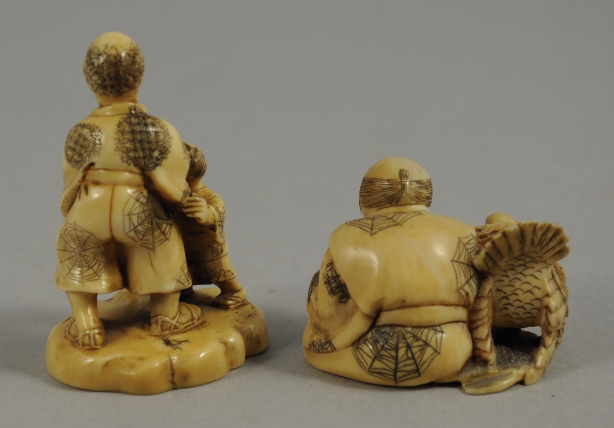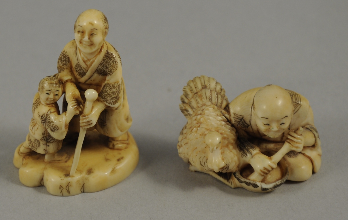 Réunion de deux NETSUKES en ivoire. L'un représente un homme accroupi avec un dindon. L'autre figure un vieillard debout, avec sa canne, tenant par la main un enfant. Signés dans un cachet rouge sous la base.