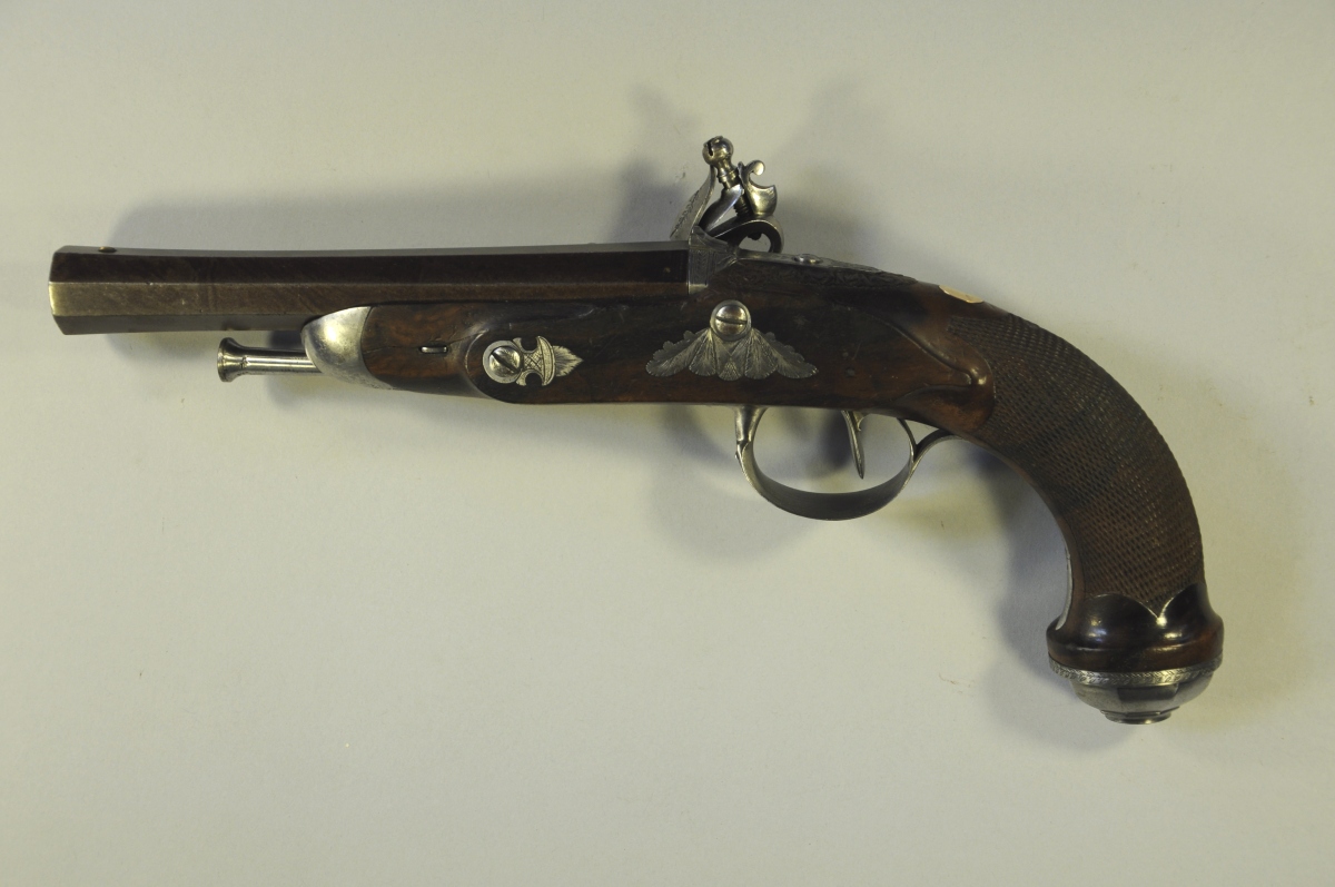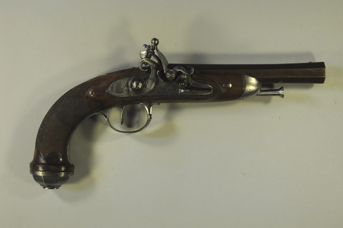 PISTOLET à silex. Platine marquée "CADET". Canon octogonal légèrement tromblonné. Motifs ciselés de fleurs, de canards et d'un petit paysage sur les platines. Crosse quadrillée en noyer, avec décor sculpté de fleurs et de feuilles à la base du canon.