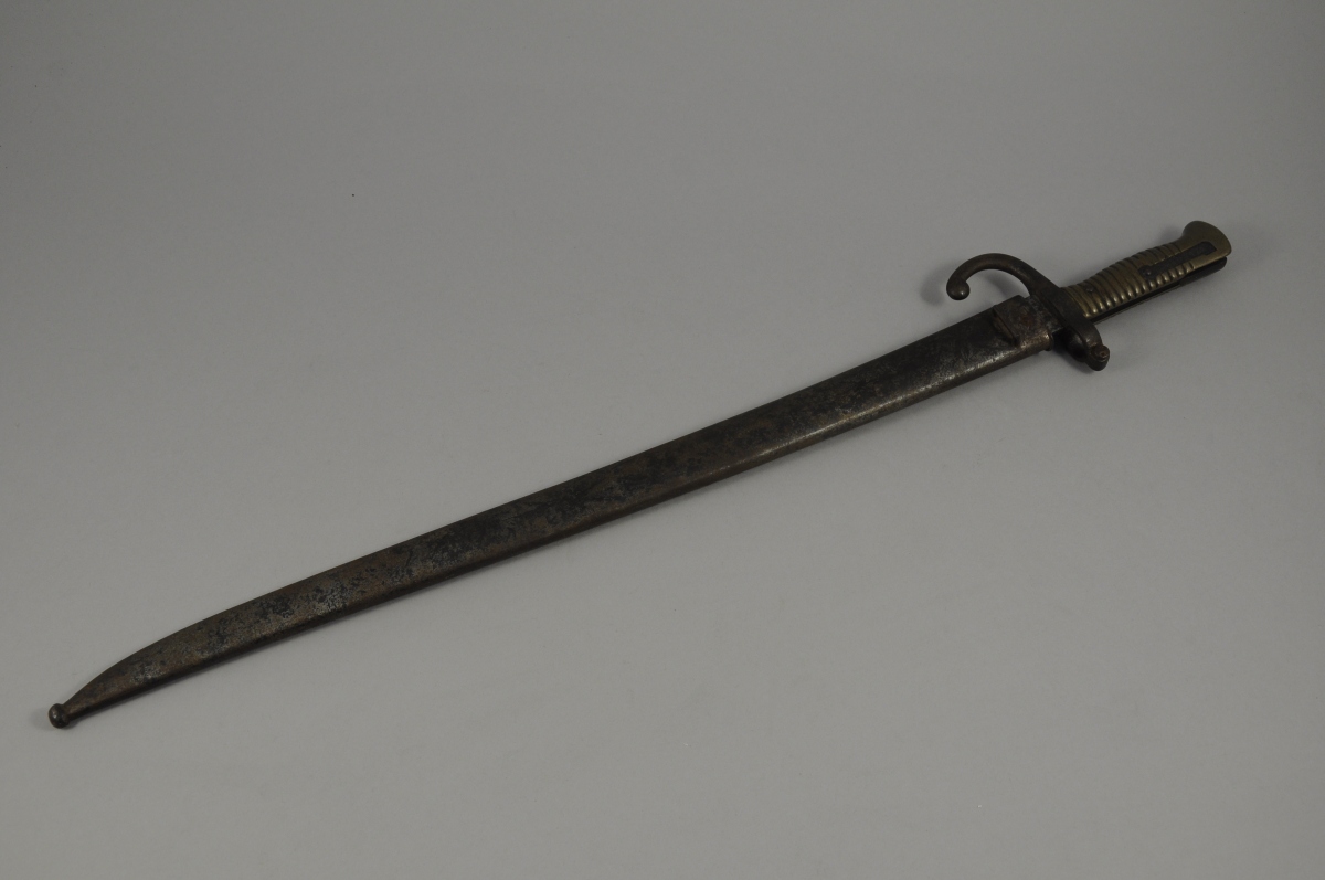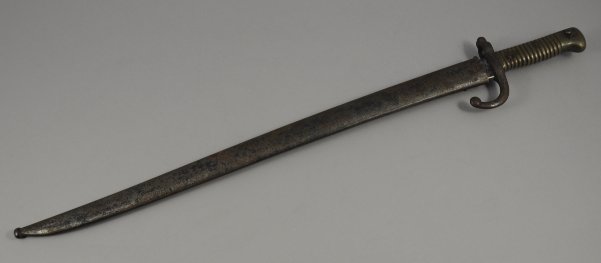 BAÏONNETTE "Chassepot", modèle 1866. Dos de lame marqué "Mre Imple de St-Etienne 1867". Avec fourreau (numéro différent de celui de la lame).