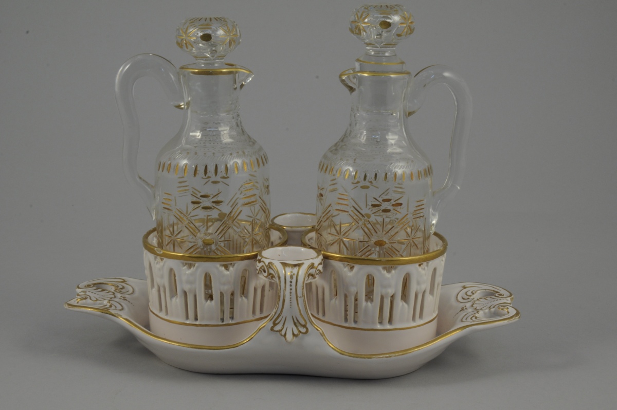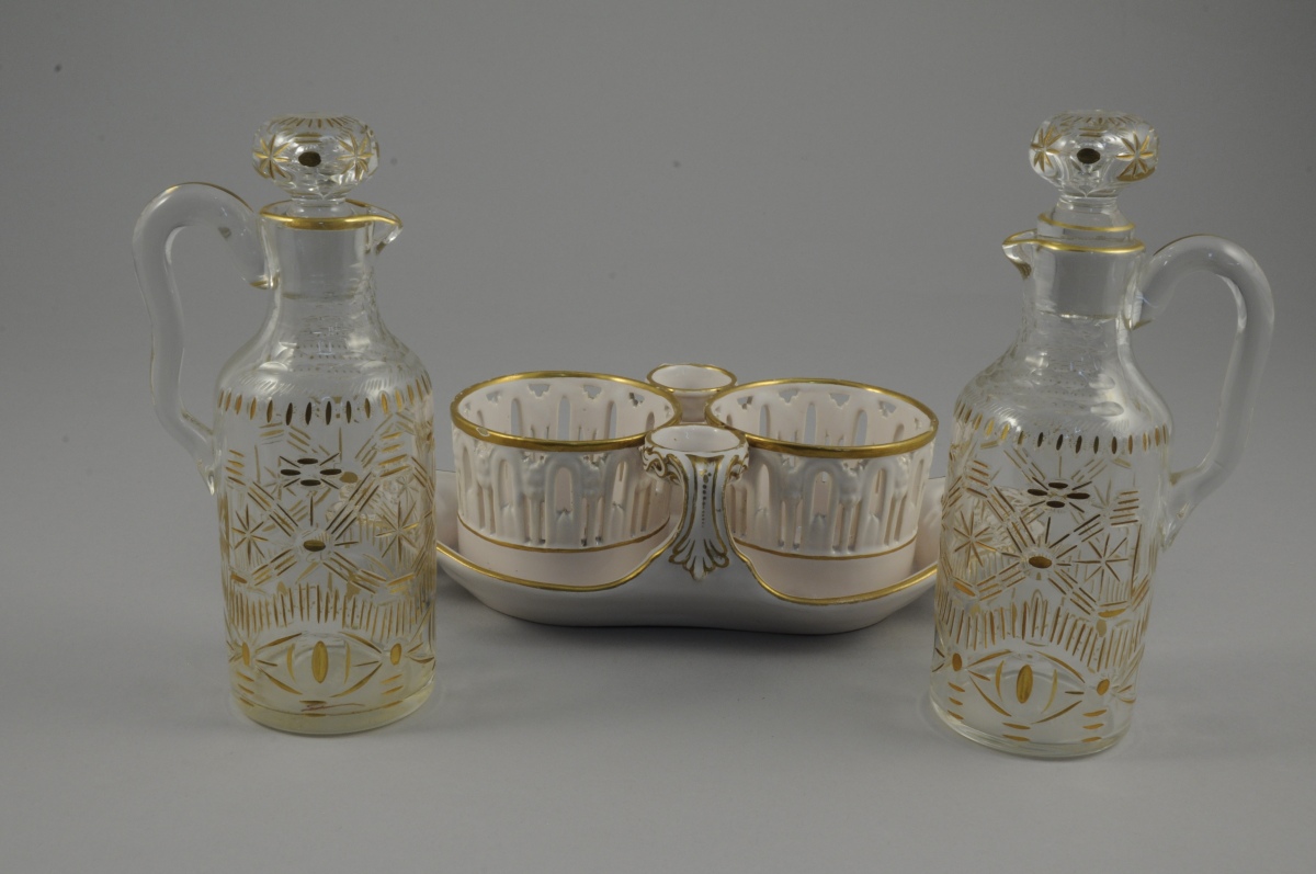EST de la FRANCE. PORTE-HUILIERS en faïence fine réhaussée d'or. Décor ajouré de cannelures et anses en volutes feuillagées.