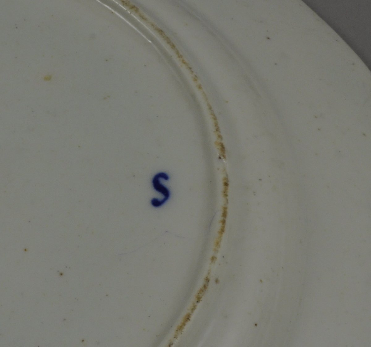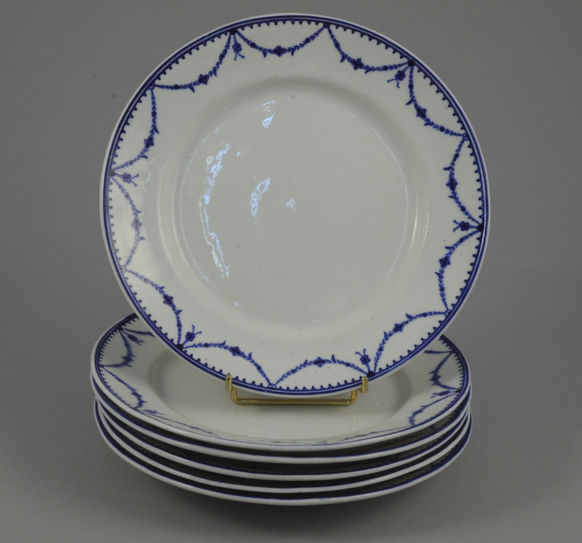 TOURNAI (?). Suite de SIX ASSIETTES en porcelaine tendre à décor en bleu, sur l'aile, de guirlandes nouées de rubans. Marque "S". XIXème. Diam. 23,5 cm.