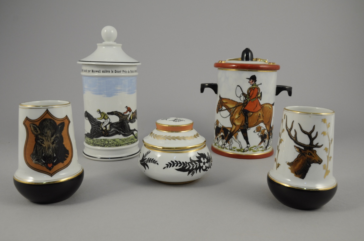 Joint : BONBONNIÈRE en porcelaine de Couleuvre, à décor floral et filets dorés. Diam. 10 cm ; POT COUVERT en porcelaine d'Auteuil, à décor d'une course hippique. Haut. 22 cm.