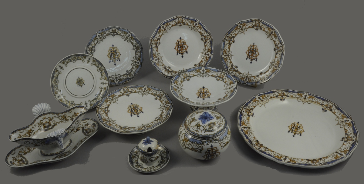 GIEN. SERVICE DE TABLE du château d'ESCLIMONT. 79 pièces : 18 assiettes plates, 18 assiettes à dessert, 9 assiettes creuses, 2 assiettes-présentoirs, 2 saucières avec plateau attenant, un grand plat rond, une coupe sur pied, un sucrier avec sa soucoupe, un moutardier.