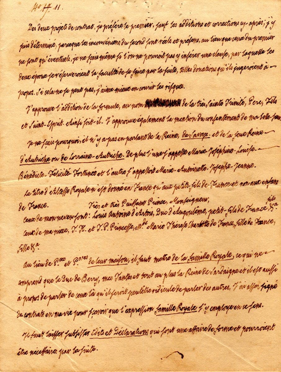 " Pour éviter toute discussion sur l'ordre dans lequel les témoins que j'appelle à la signature du contrat et de l'acte de célébration de mariage de mon neveu avec ma niece, seront nommés dans ces actes et les signeront, mon intention est de suivre à cet égard la regle établie pour l'Ordre du St Esprit, c'est à dire, de faire passer les premiers ceux qui sont Ducs et Pairs ou héréditaires, suivant l'ancienneté de leurs Duchés et ensuite ceux qui ne le sont pas, suivant l'ancienneté de leurs grades militaires respectifs "... Il dresse deux listes nominatives, pour le contrat de mariage et la célébration... - " Je crois qu'il est convenable d'appeler aussi à la signature du contrat l'Abbé EDGEWORTH à qui je veux donner toutes les distinctions qui sont en mon pouvoir, ainsi que l'Abbé Marie en qualité de Précepteur du marié. S'il est d'usage, ce que j'ignore, que des femmes signent comme témoins, nous y appellerons Mde la Csse de La Tour d'Auv. et Mde la Dsse de Serent "... - " 1° On me presse de ne pas faire le mariage au château, parce que la chapelle est trop petite pour contenir ce qu'il y a de François ici et cette raison me touche si fort, que je crois que malgré la laideur de la Paroisse, j'y céderai. 2° A l'article de mon frere, il faut mettre Ch. Ph. de France, fils de France (Monsieur) frère du Roi "... - Il préfère le premier projet de contrat, sous quelques réserves concernant la dénomination de la Reine et de la feue Reine [sa femme et sa belle-sur, Marie-Antoinette], l'emploi abusif du titre d'Altesse Royale (" donné en France aux petits-fils de France et non aux enfans de France "), et quelques autres formulations. Il désigne les témoins...